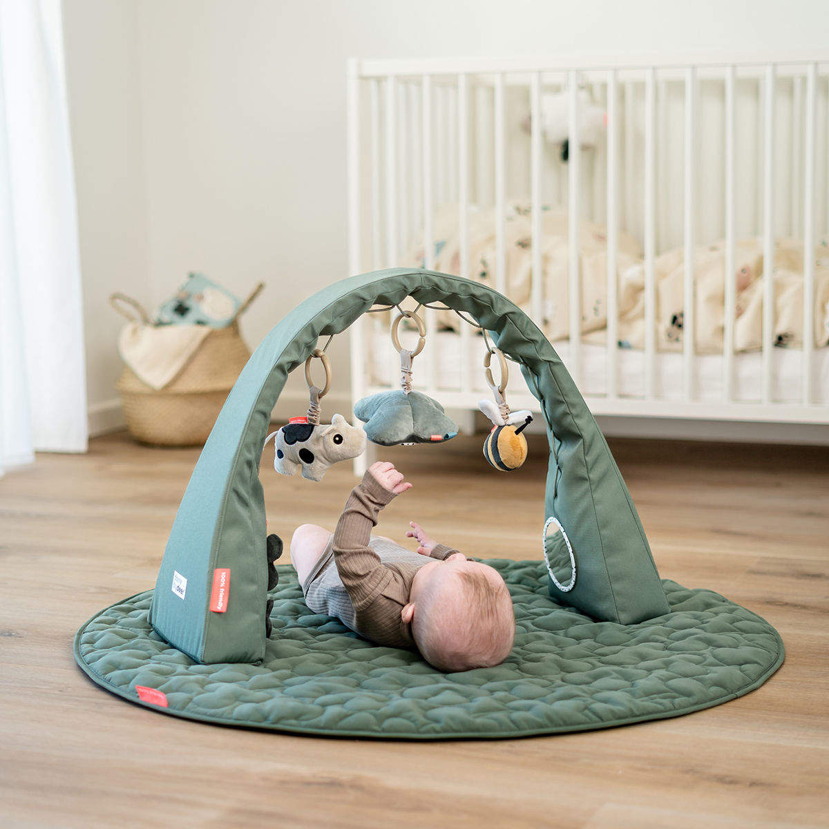 This green activity gym encourages coordination, builds strength, and supports your baby’s early sensory exploration, and can be used on a play mat, over a cozy nest, or wherever your baby loves to play.