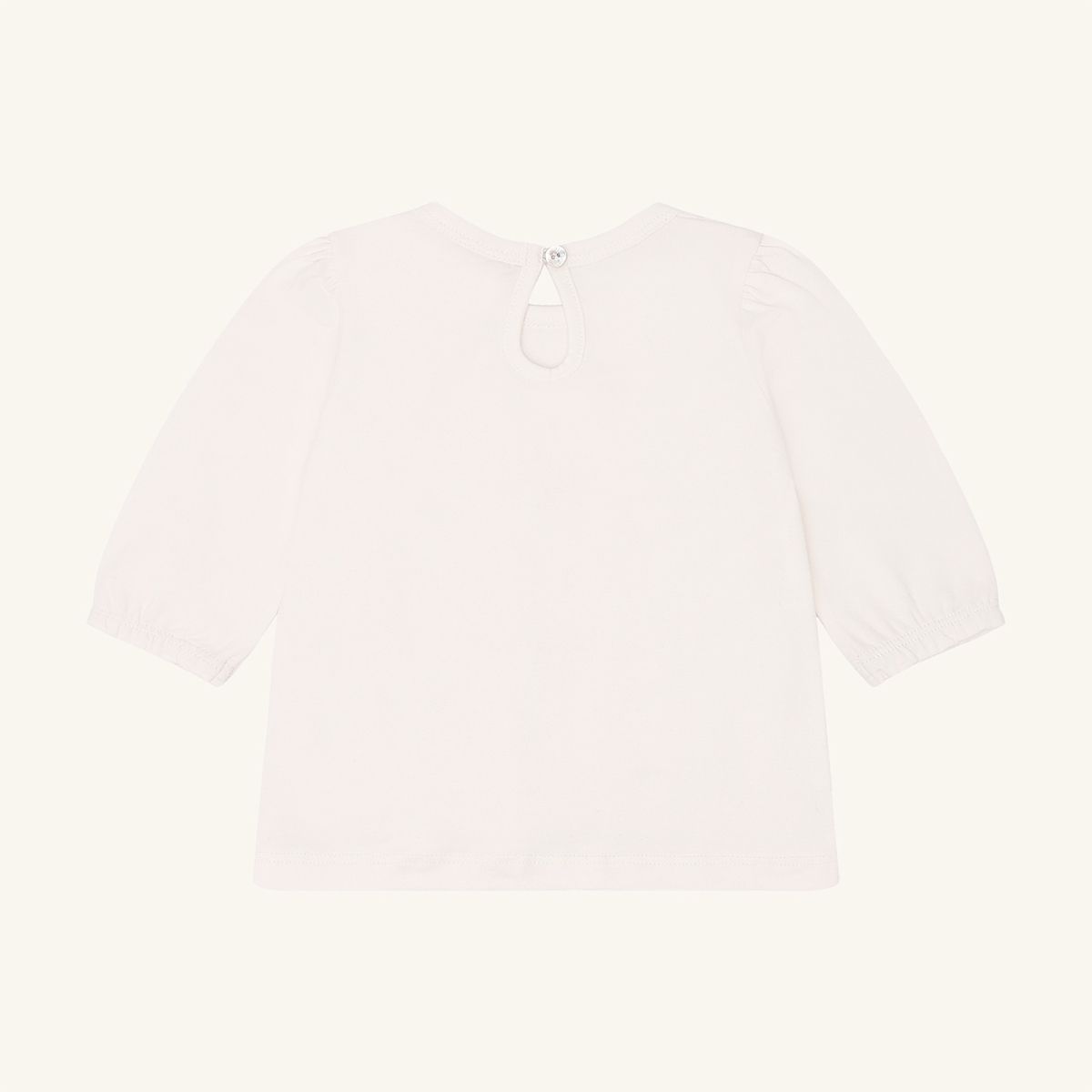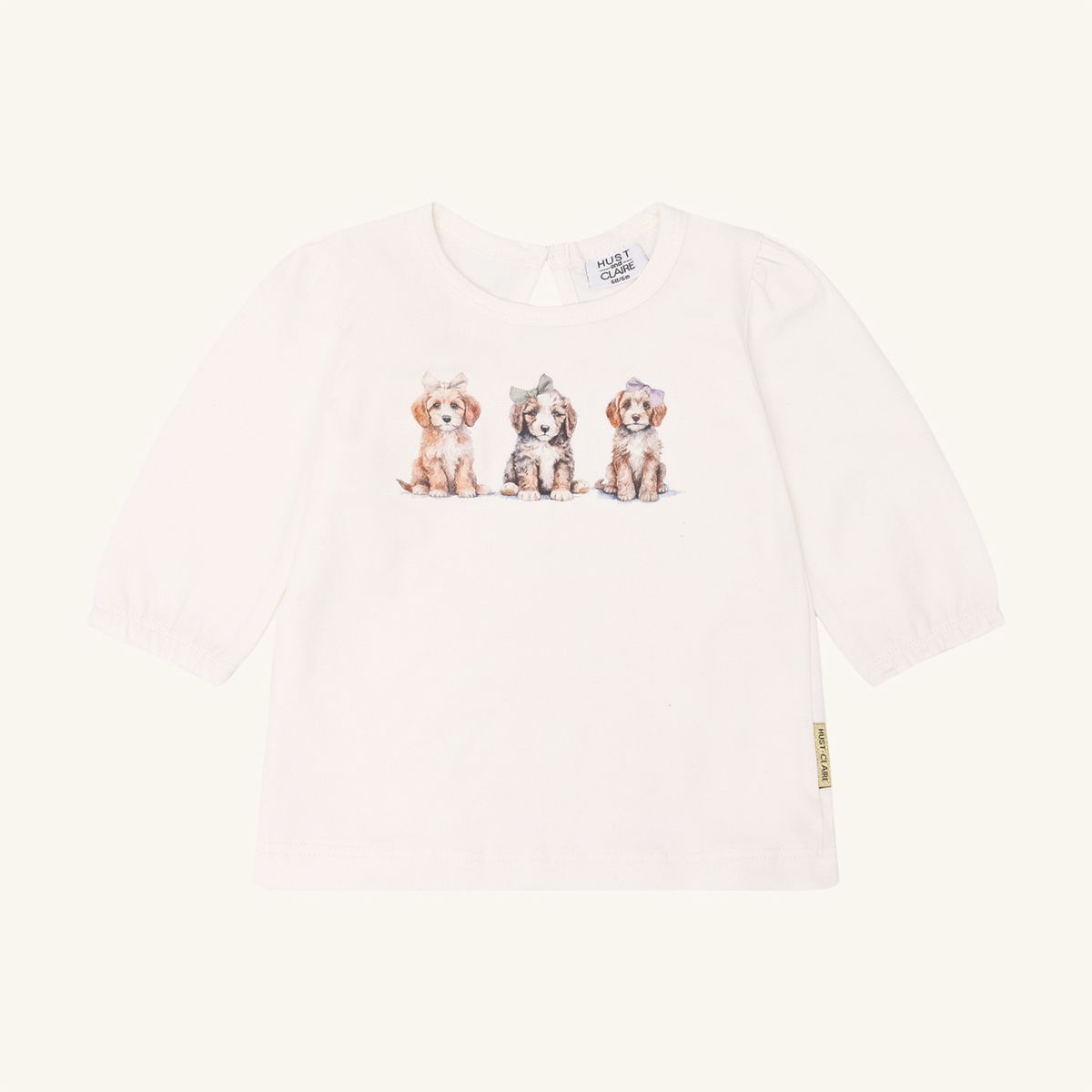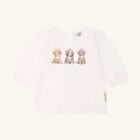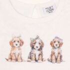 Long-sleeved T-shirt – Shirt in soft, stretchy cotton, decorated with a print of three dogs with bows on the front. Sizes 86-128 have tulle bows. The garment has gathered shoulders, elastic sleeves and a button closure at the neck.