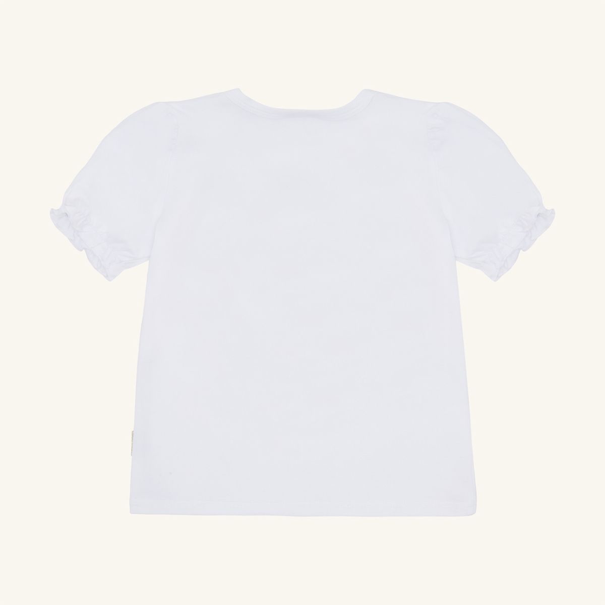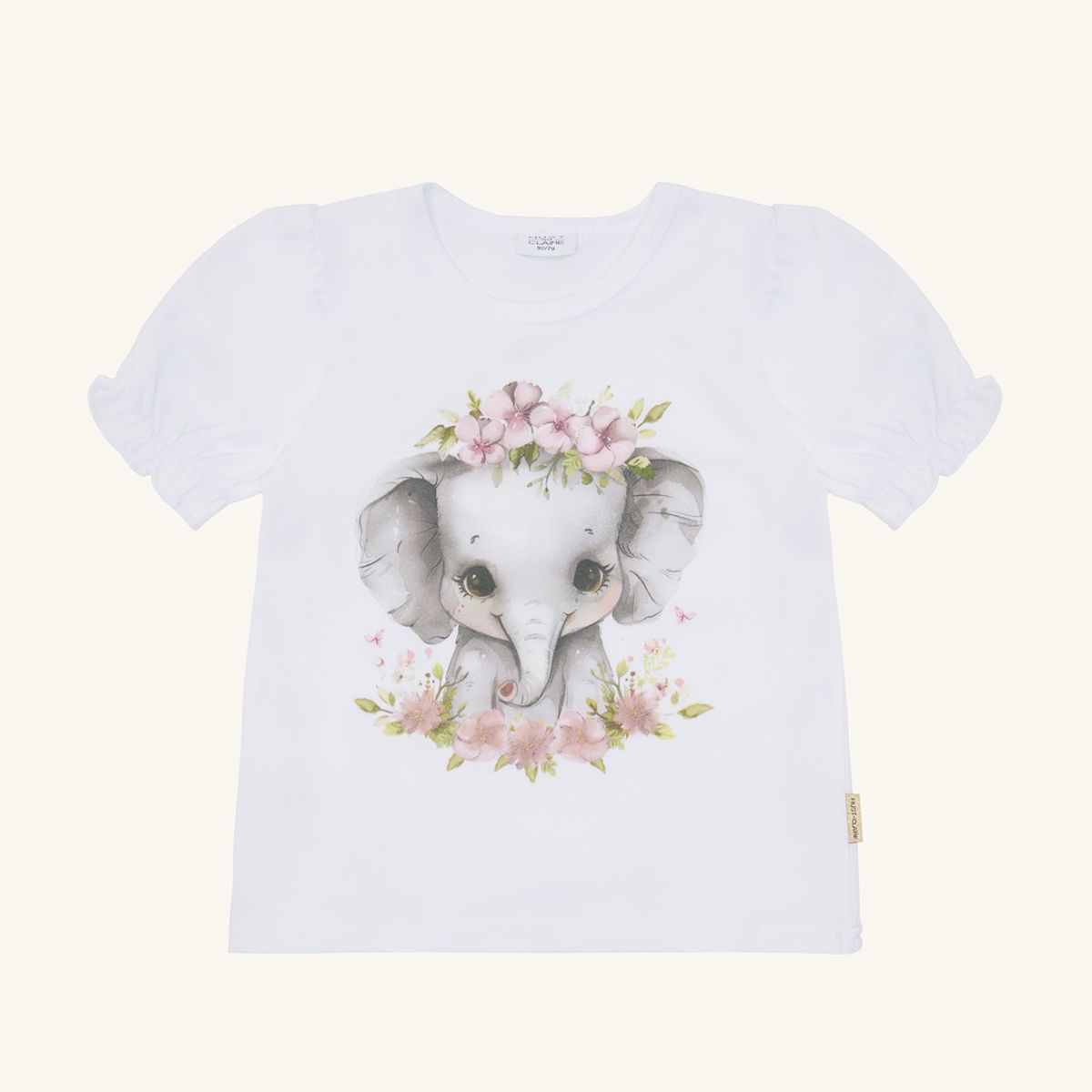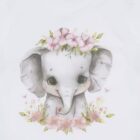 Short-sleeved T-shirt-Shirt in soft, stretchy cotton with gathered shoulders and elastic sleeves. The front is decorated with a motif of an elephant adorned with flowers. The T-shirt-Shirt has a C button at the neck in sizes 56-80.