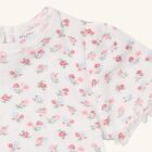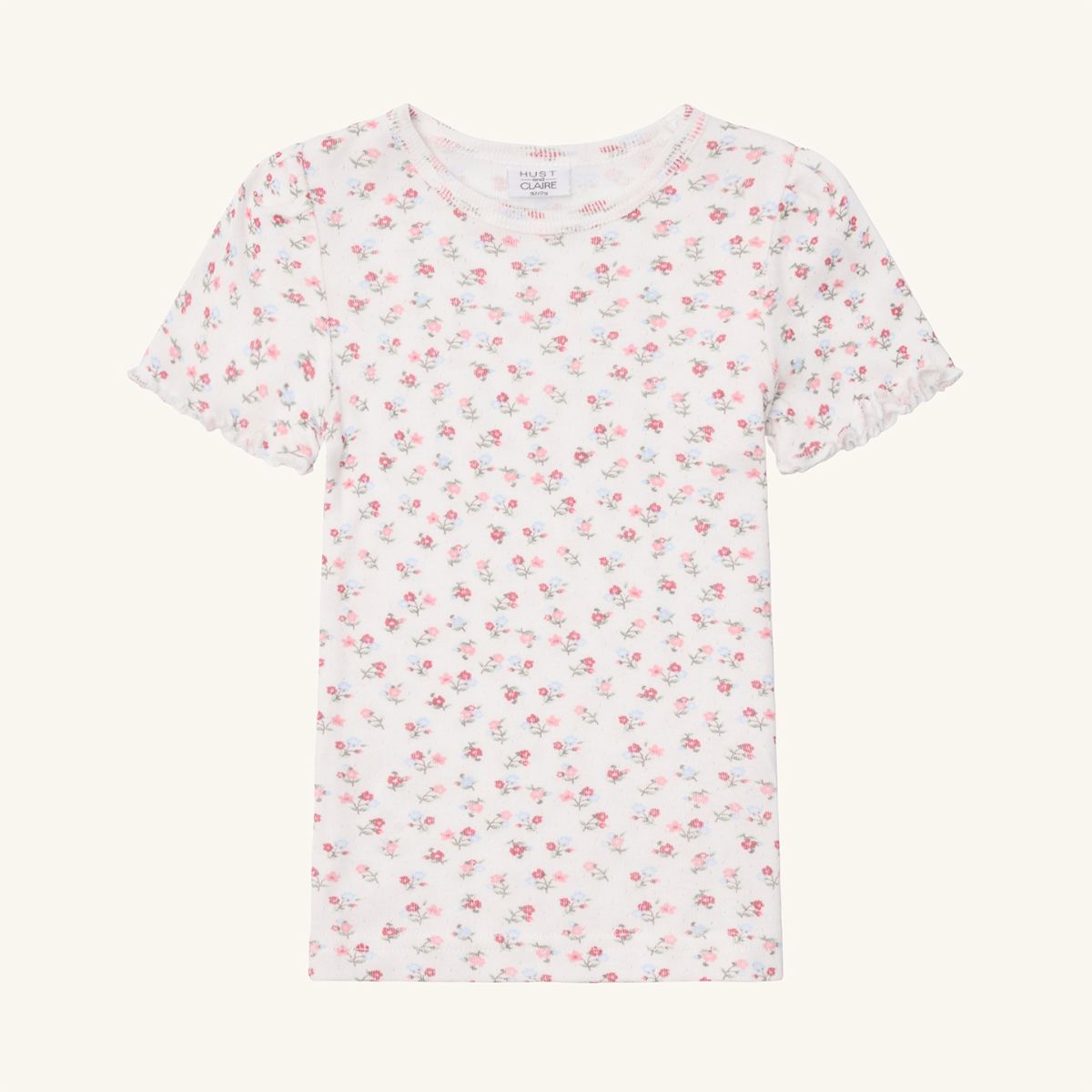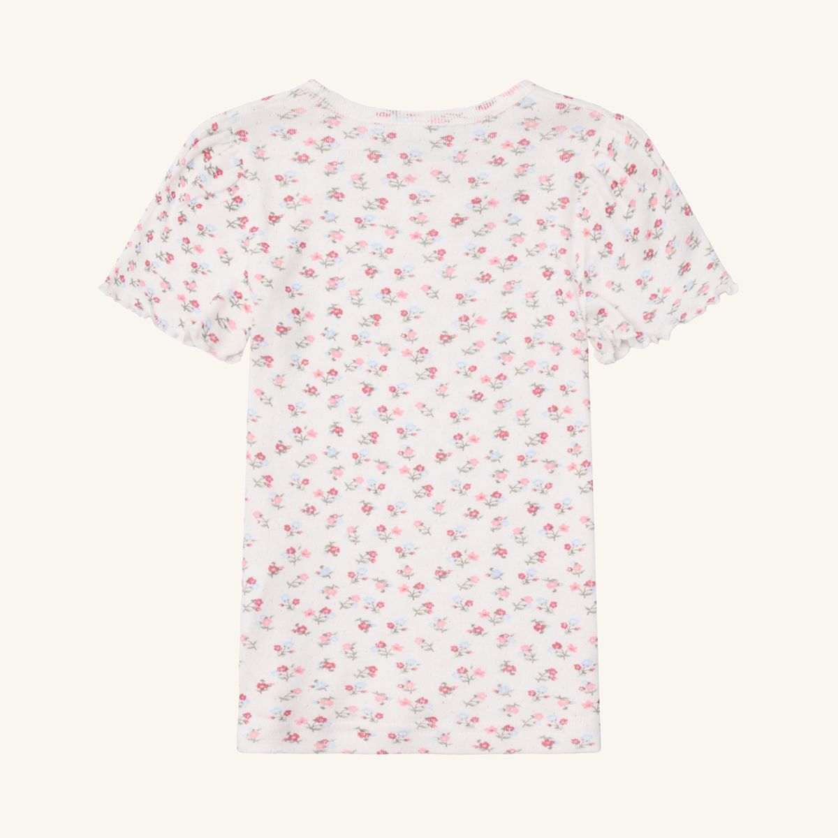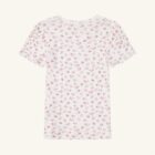 Short-sleeved T-shirt-Shirt in a soft, stretchy cotton blend with a floral print, lace pattern and ruffled sleeves. The garment has a button closure at the neck in sizes 56-80.