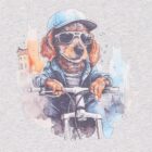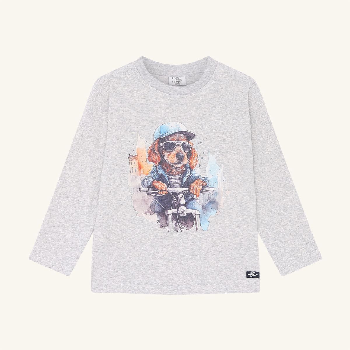 Long-sleeved T-shirt made of soft, stretchy cotton with a print of a dog on a bicycle on the front.