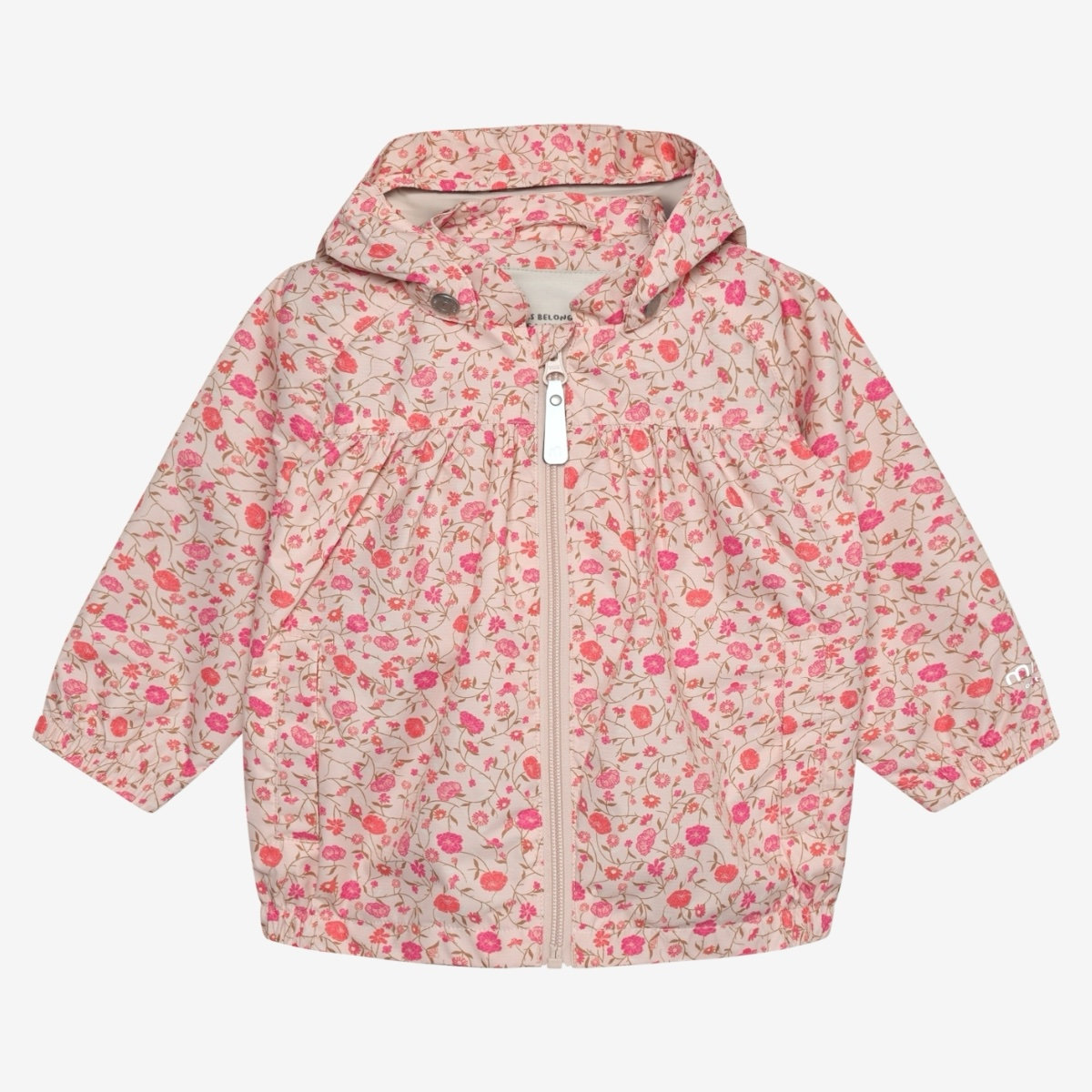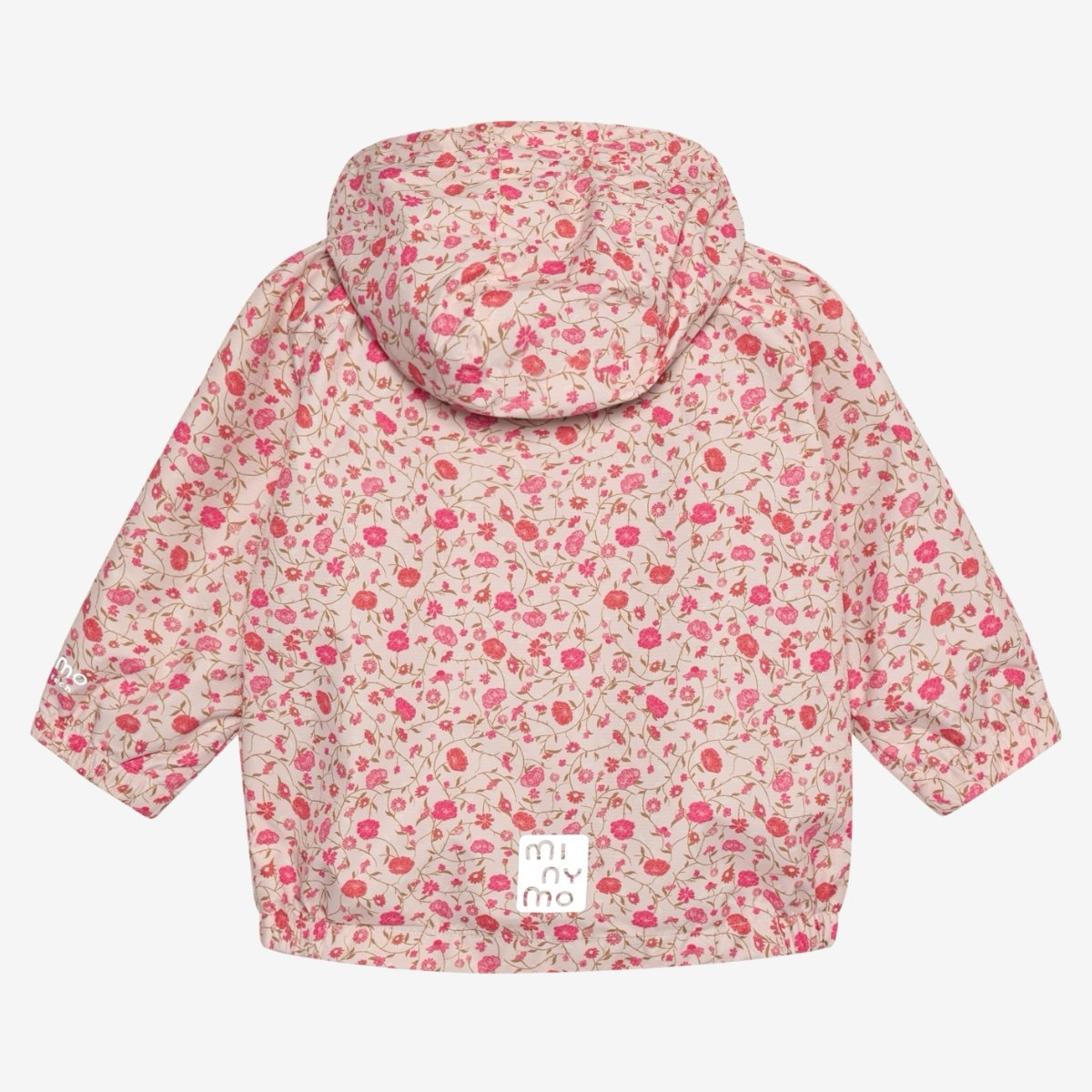 Jacket with all-over print from Minymo. The jacket has a water column pressure of 10,000 mm and a breathability of 3,000 g/m². It is windproof and has reflective details. Additionally, the jacket features a detachable hood and front pockets. Coated with BIONIC FINISH® ECO. Certified acc. to GRS – Made with more than 50% Recycled Material