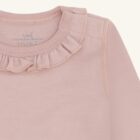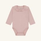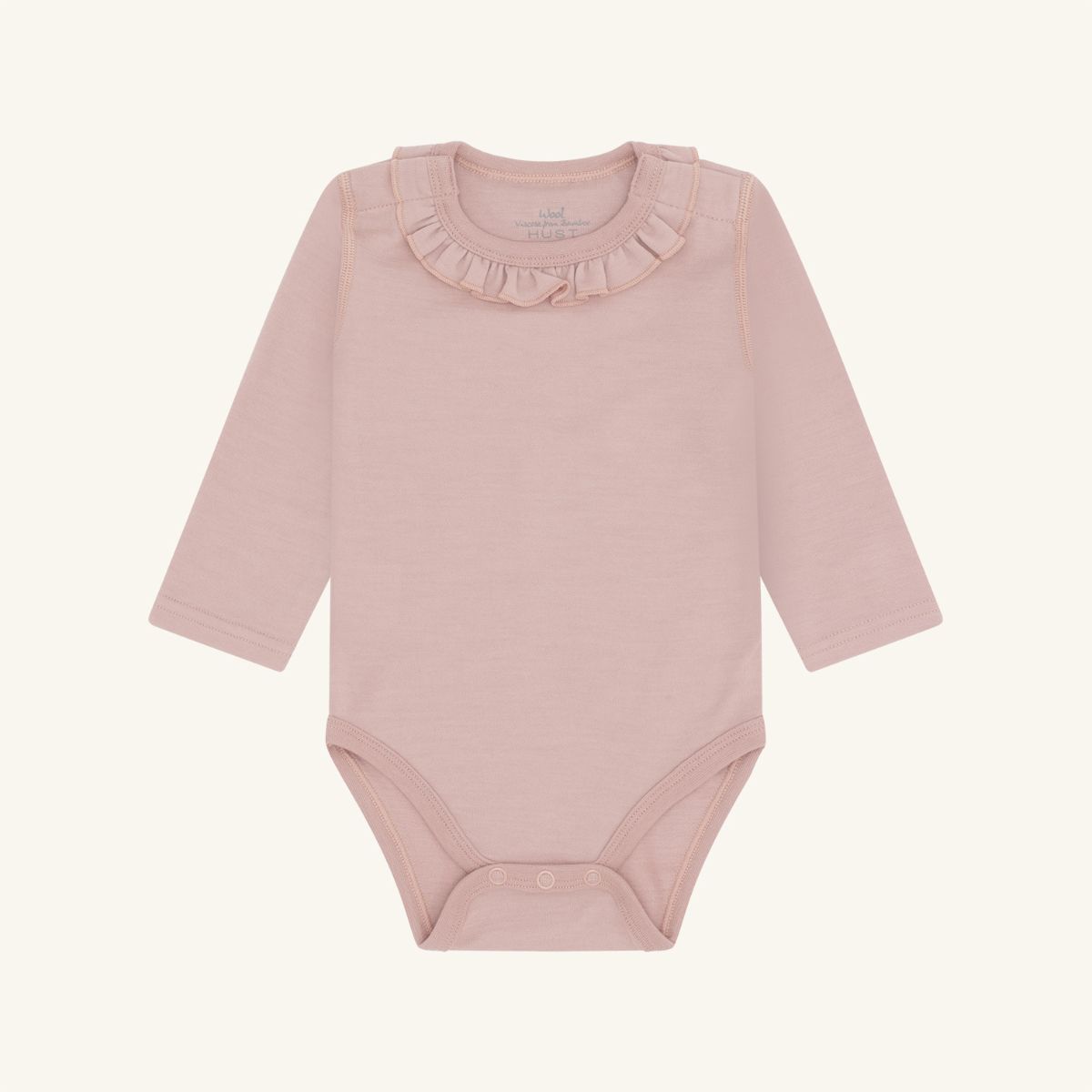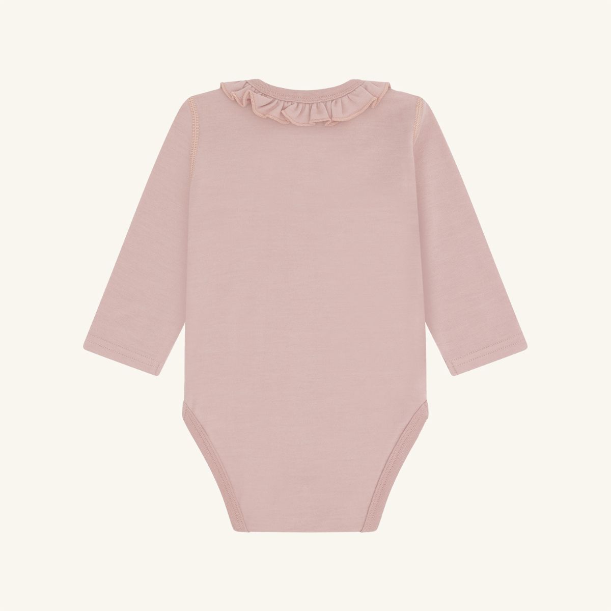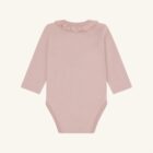 Long-sleeved bodystocking in a lovely wool and bamboo viscose mix. The model has a sweet flounced collar and is fastened with popper press studs at the crotch and at the left shoulder. This product is Oeko-Tex 100®-certified.