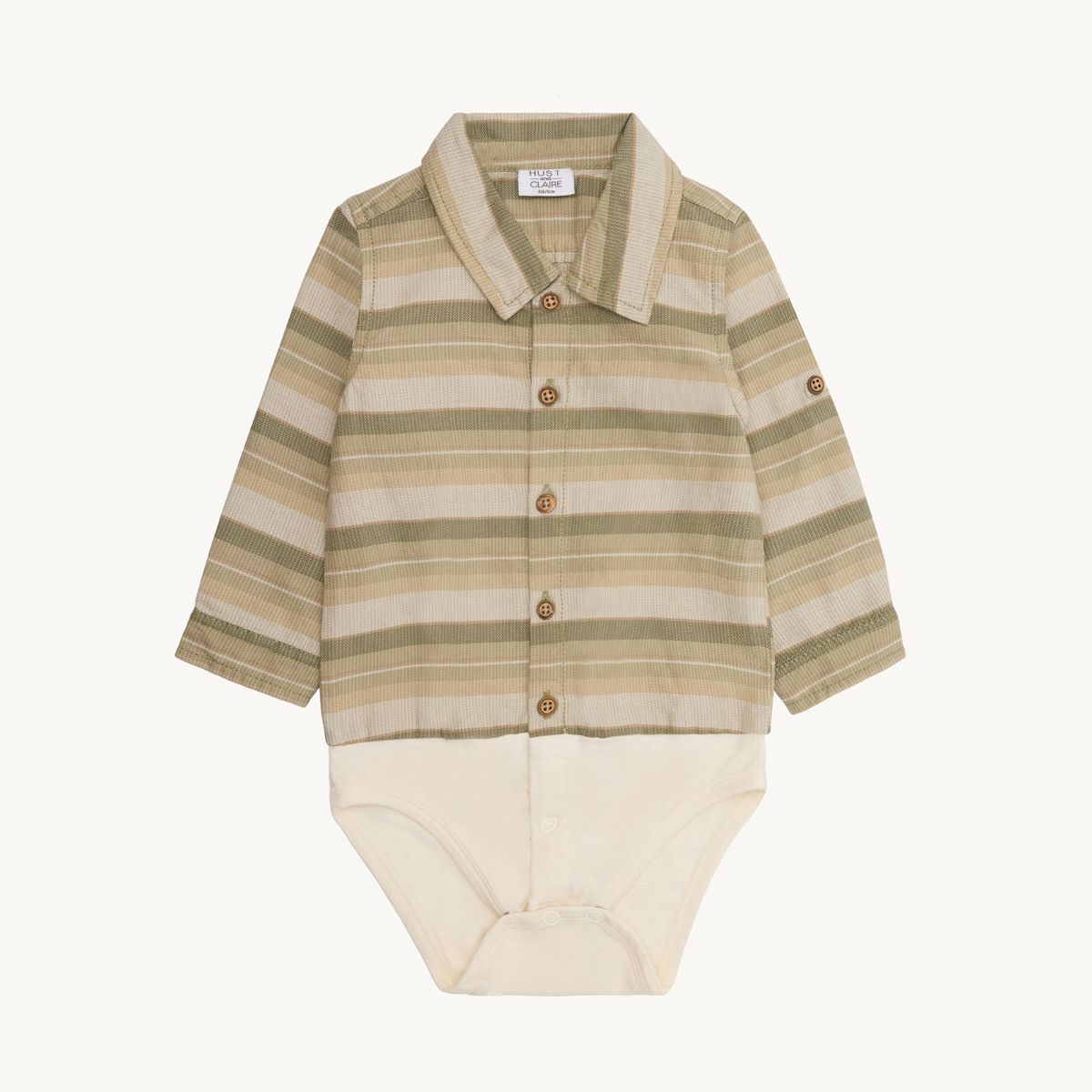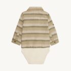 Cotton bodysuit with a striped shirt at the top and jersey at the bottom. The shirt is woven with a collar and cuffs. The garment closes with regular imitation wood buttons at the front and press studs at the bottom of the jersey and between the legs.