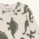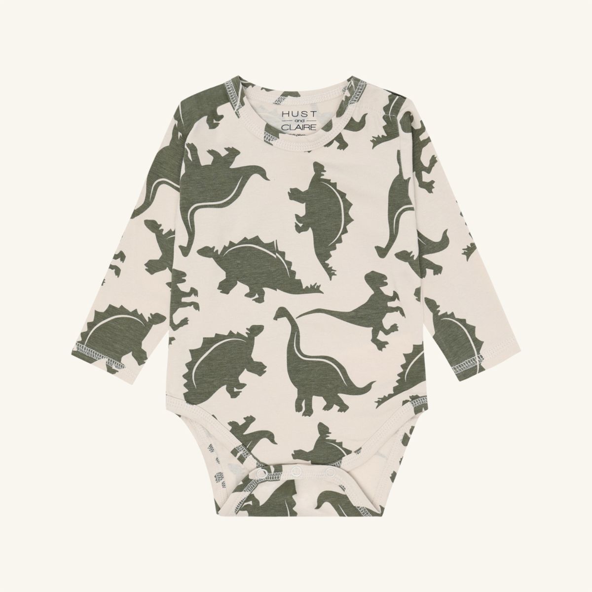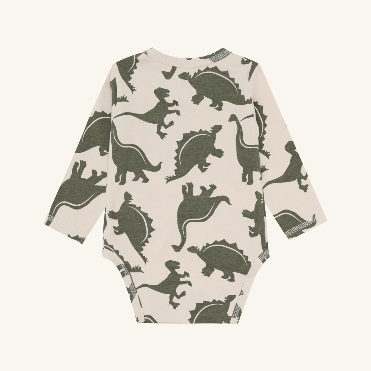 Long-sleeved body in a soft cotton blend with a cool dinosaur print. The body has a round neckline and snap buttons between the legs, making it easy to put on and take off.