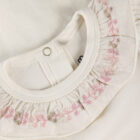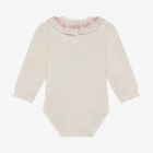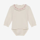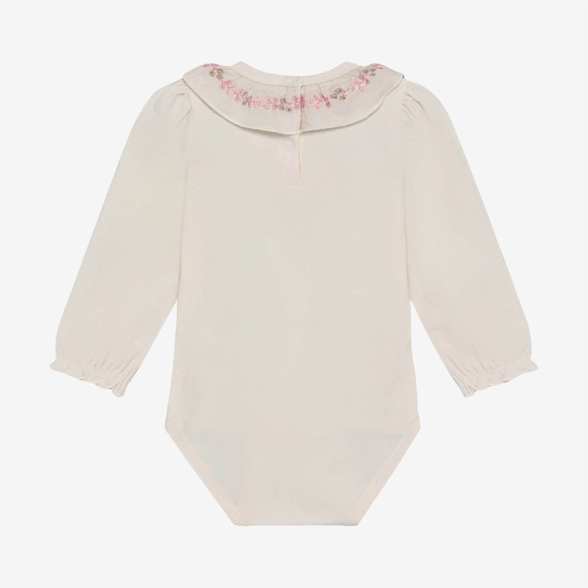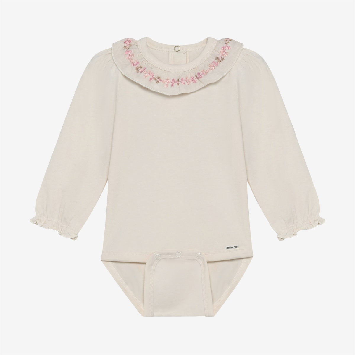 Long-sleeved bodysuit from Minymo. The bodysuit is solid-colored with a detailed ruffle around the collar. The cuffs have pleats and are elastic. It closes with snap buttons between the legs. The bodysuit is made from an organic cotton blend.