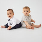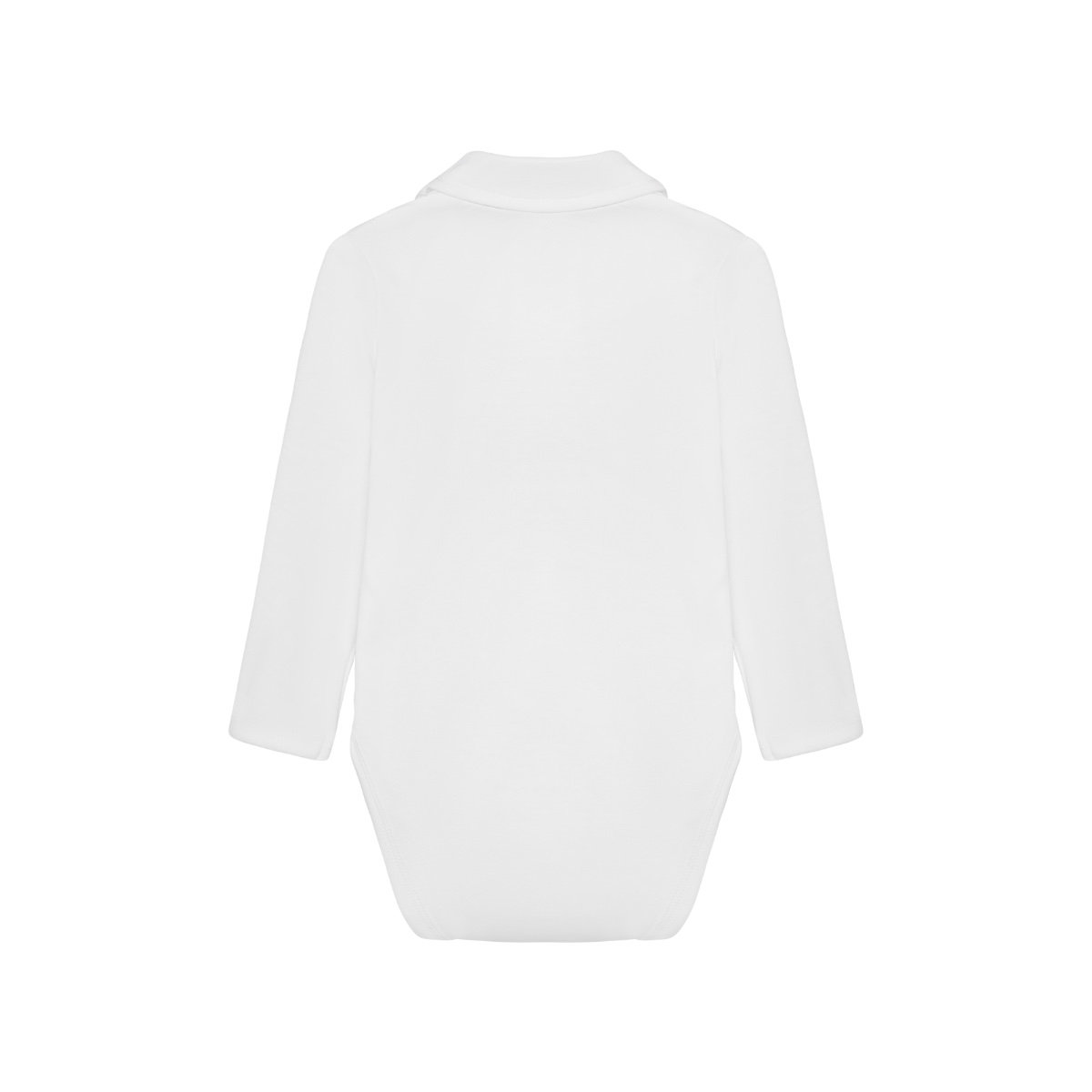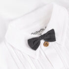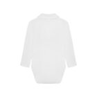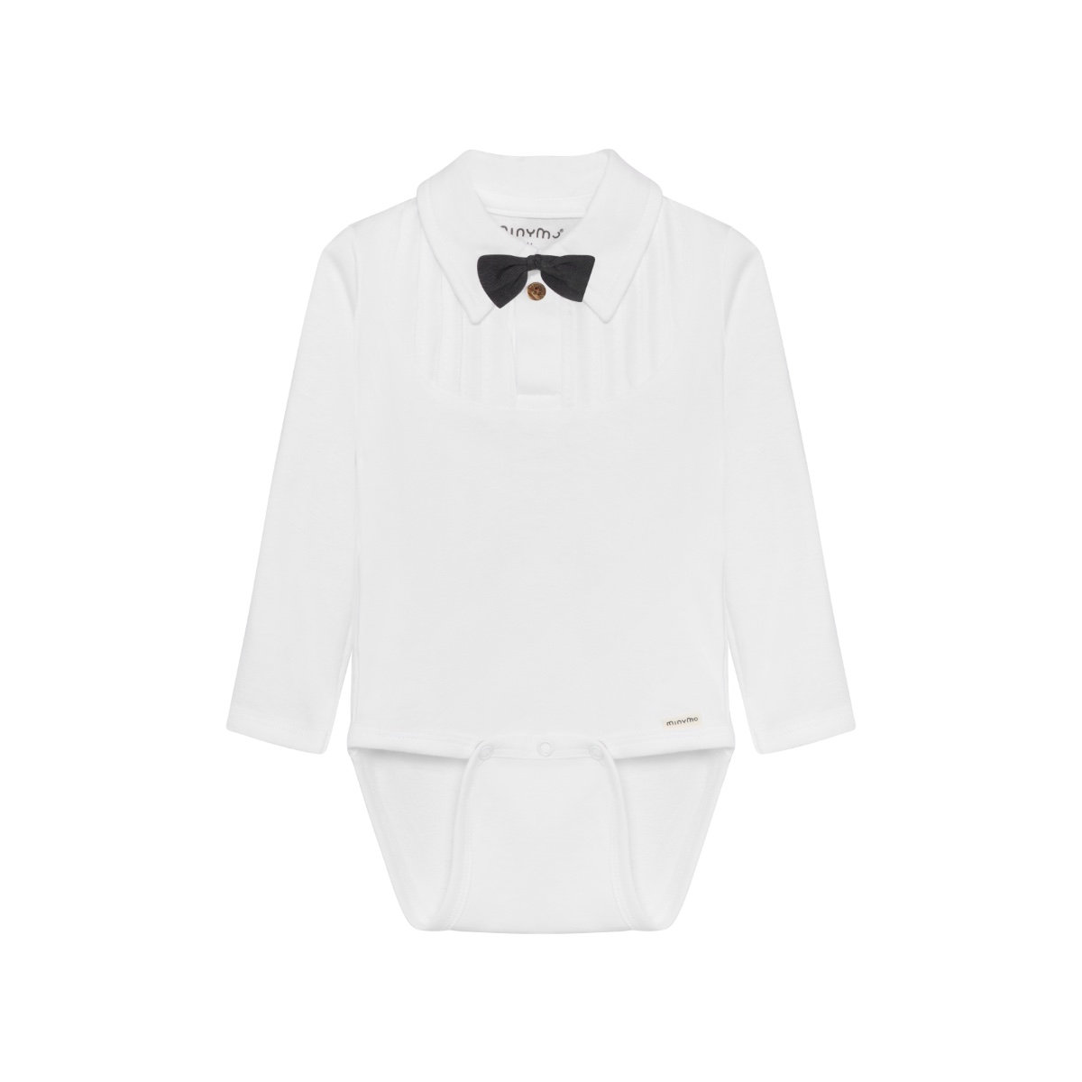Bodysuit with bow tie from Minymo. The bodysuit is solid-colored with a collar, buttons at the top, and a sewn-on bow tie. The bodysuit closes with snap buttons between the legs. Made with 100% certified organic cotton. Certified acc. to GOTS – organic CERES-0366