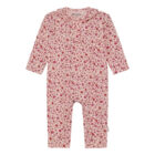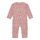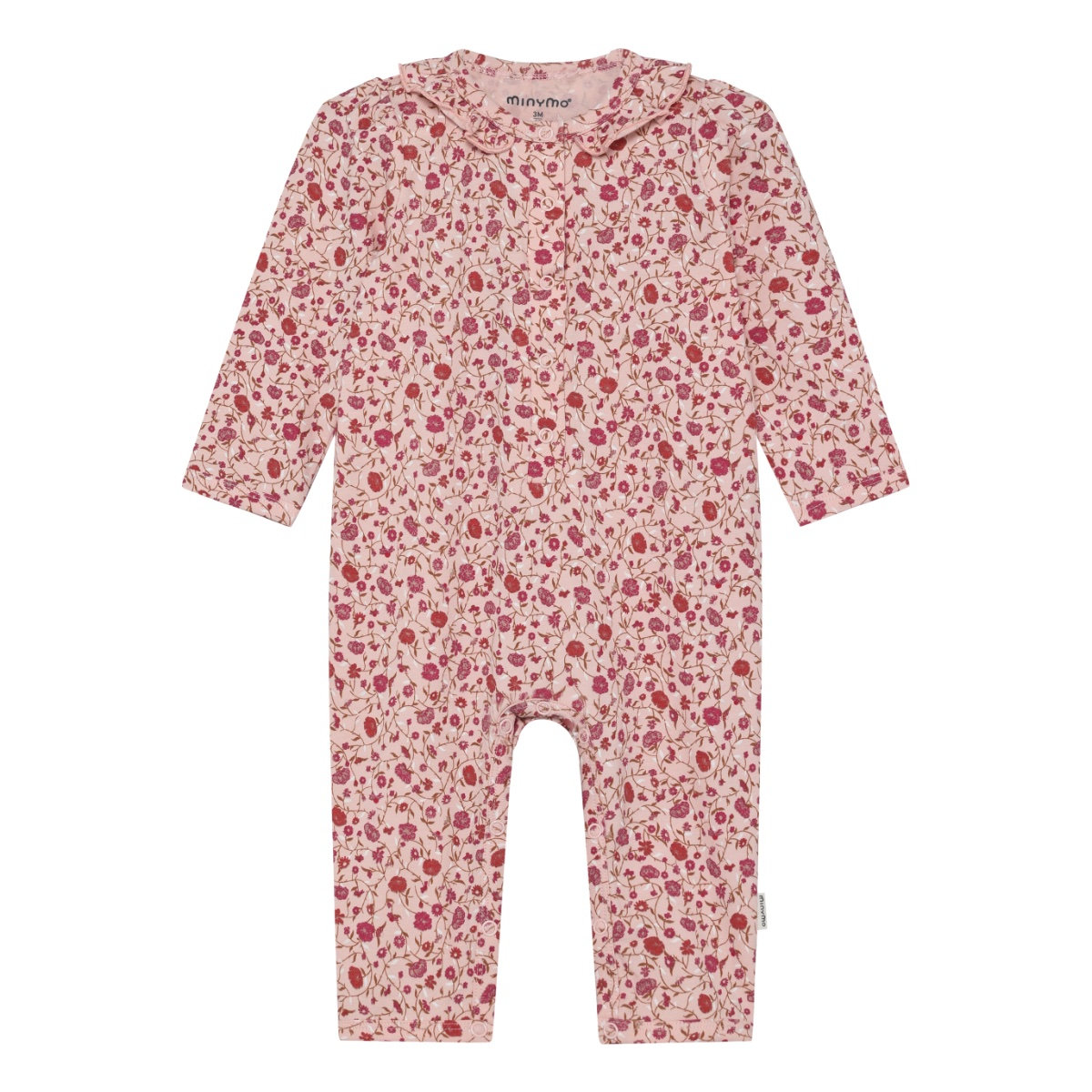 Bodysuit with long sleeves and legs from Minymo. The bodysuit features an all-over print. The collar is decorated with a frill. The bodysuit fastens with buttons at the front and along the legs. Certified acc. to GOTS – organic CERES-0366