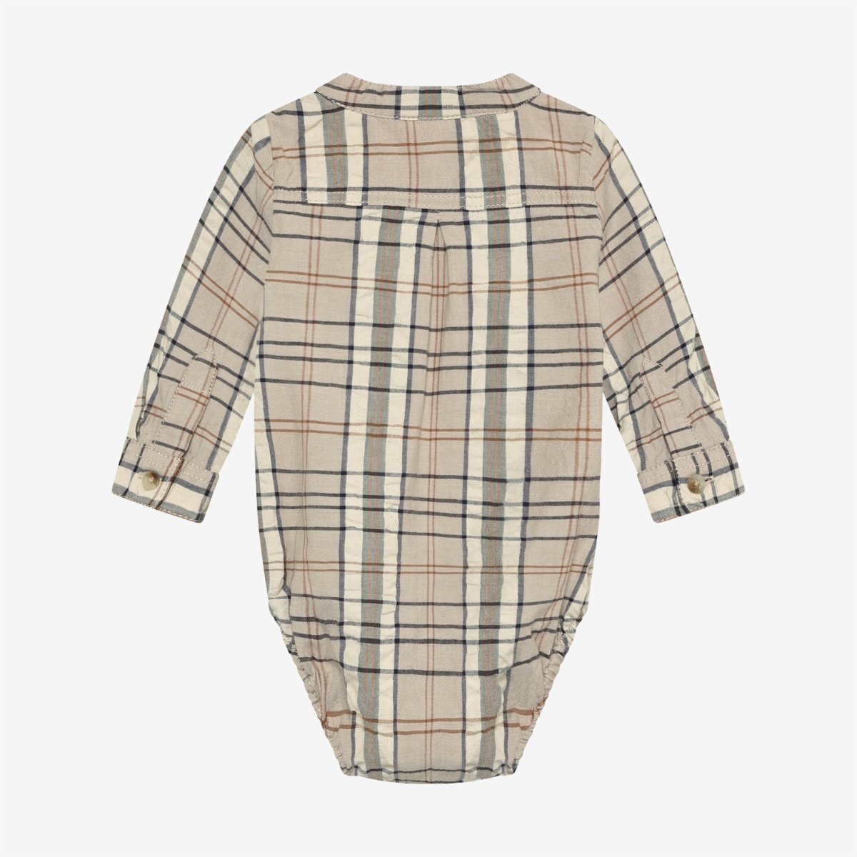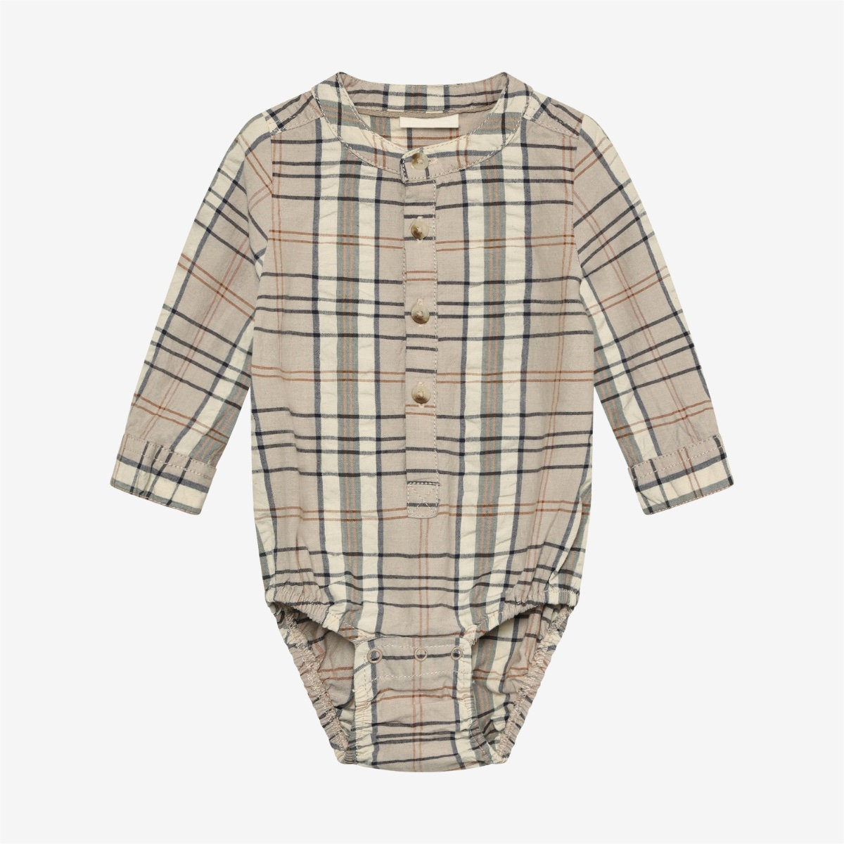 Long-sleeved bodysuit from Minymo. The bodysuit gives a shirt-like look. It features a checkered all-over print and buttons down the front. It fastens with snap buttons between the legs. The bodysuit is made of 100% cotton.