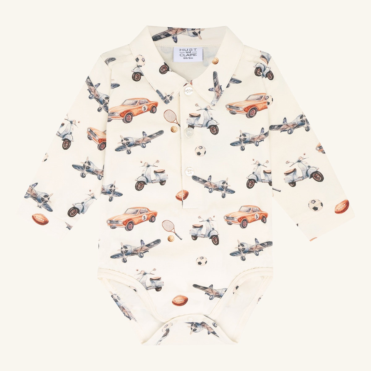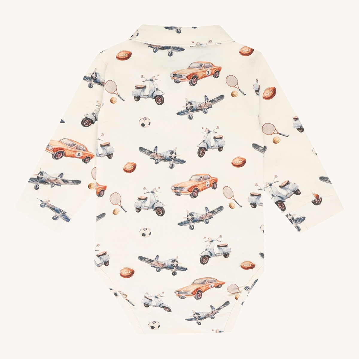 Crafted for all-day wear, this soft bodystocking ensures a gentle touch against delicate skin, making it ideal for warmer days. The long-sleeved design features a playful pattern of vintage cars, planes, scooters, and sporting equipment.