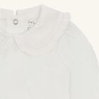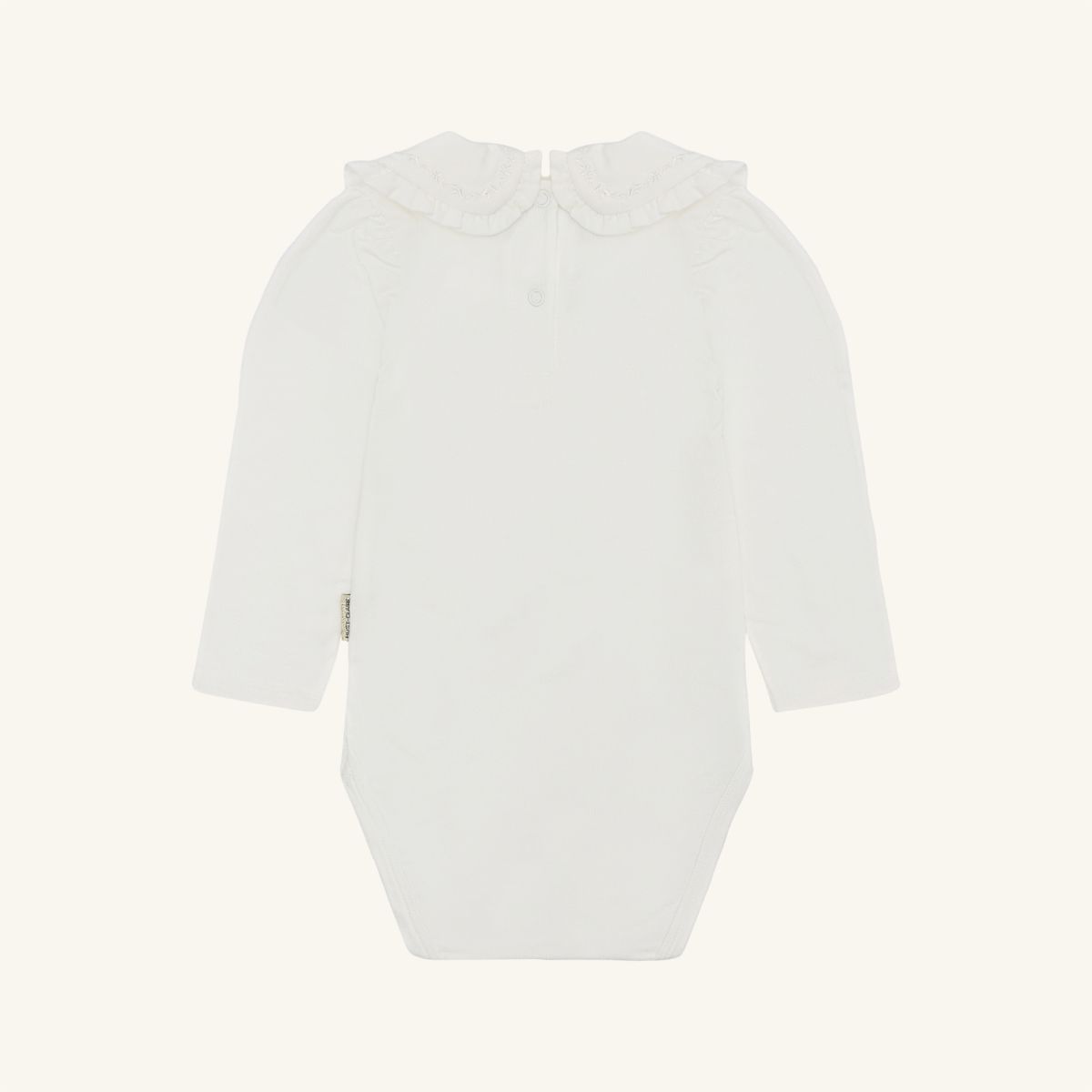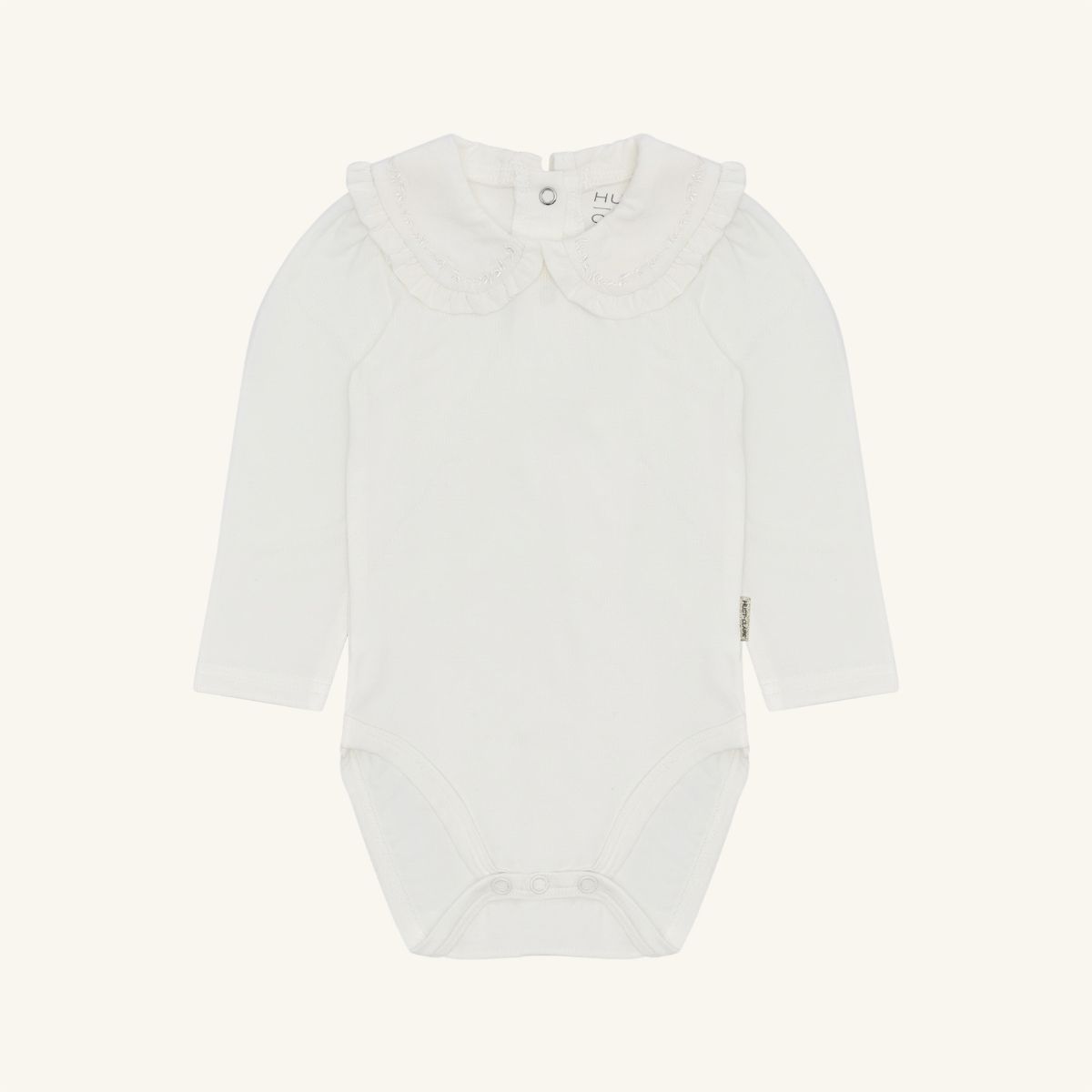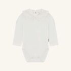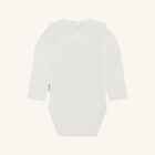 The Britt Collar Bodysuit from Hust & Claire is a timeless wardrobe essential for little ones. Made from soft viscose with a touch of elastane for gentle stretch, it offers a smooth, breathable feel against the skin. This long-sleeve bodysuit features a tight fit and a delicate Peter Pan collar trimmed with subtle embroidery and frills, perfect for both everyday elegance and special occasions. Easy snap-button closures at the back and bottom make dressing and diaper changes simple and comfortable.
