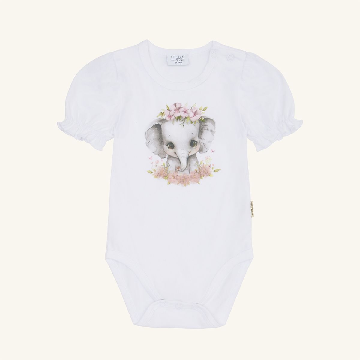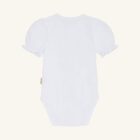 Short-sleeved bodysuit in soft, stretchy cotton, designed with gathered shoulders and elastic sleeves. The garment is decorated with an elephant adorned with tulle details. Bodysuit buttons on the left shoulder and between the legs.