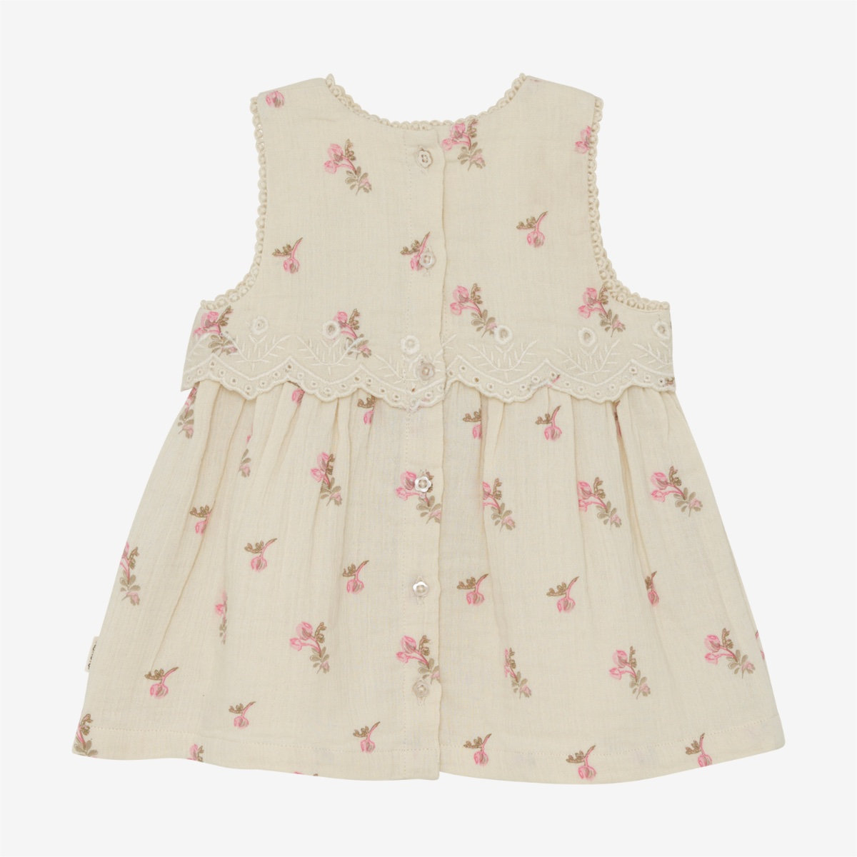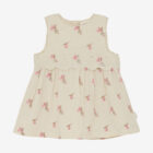 Sleeveless dress from Minymo. The dress features an all-over print and embroidery detailing around the chest. The dress is made from 100% cotton.