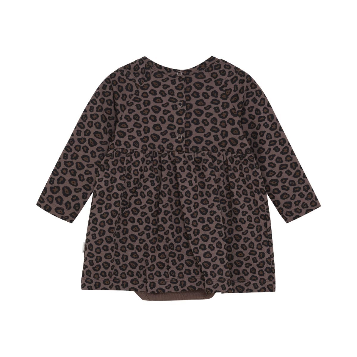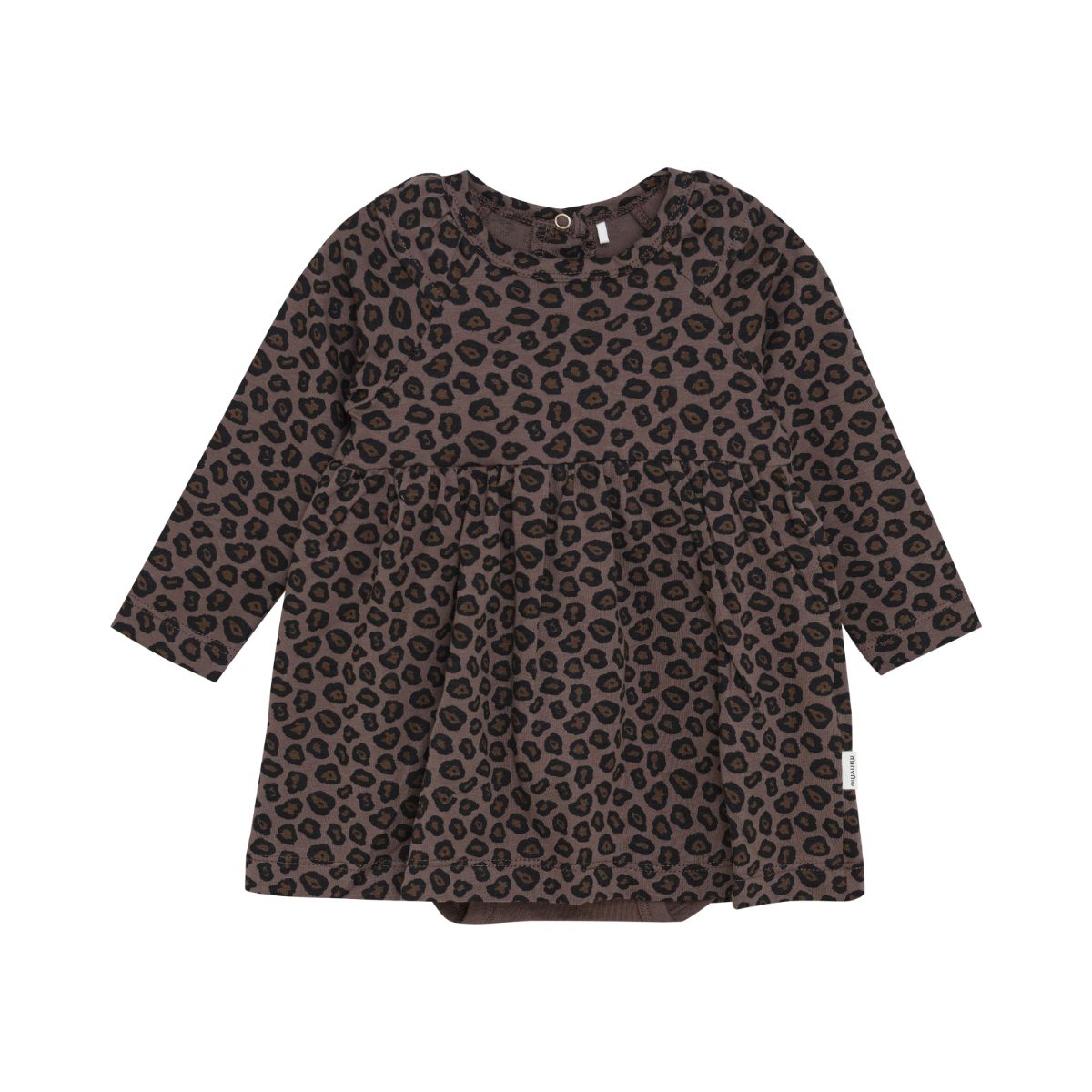 Long-sleeved dress with a lovely leopard all-over print from Minymo. The dress features discreet buttons on the back, making it easy to put on. It has a built-in bodysuit and a pretty elastic waistband that creates a sweet and practical fit. The dress is made from an organic cotton blend, which is gentle on the skin.