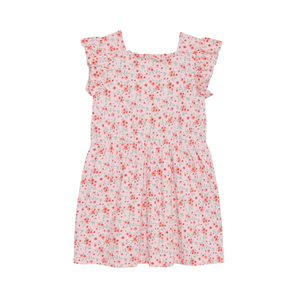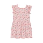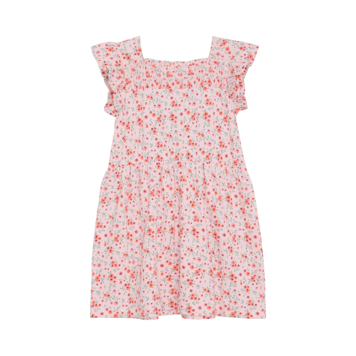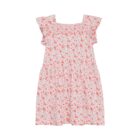 Nice short-sleeved dress with allover print from Minymo. The dress is made in a comfortable cotton blend and has a nice summery floral print all over. Large ruffles and a smock detail at the front give a nice look.