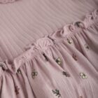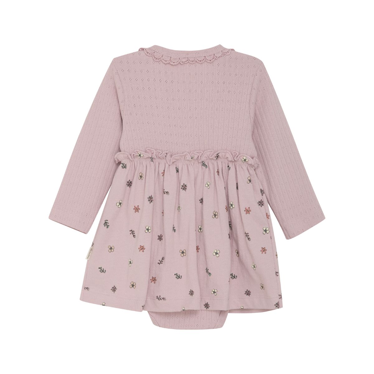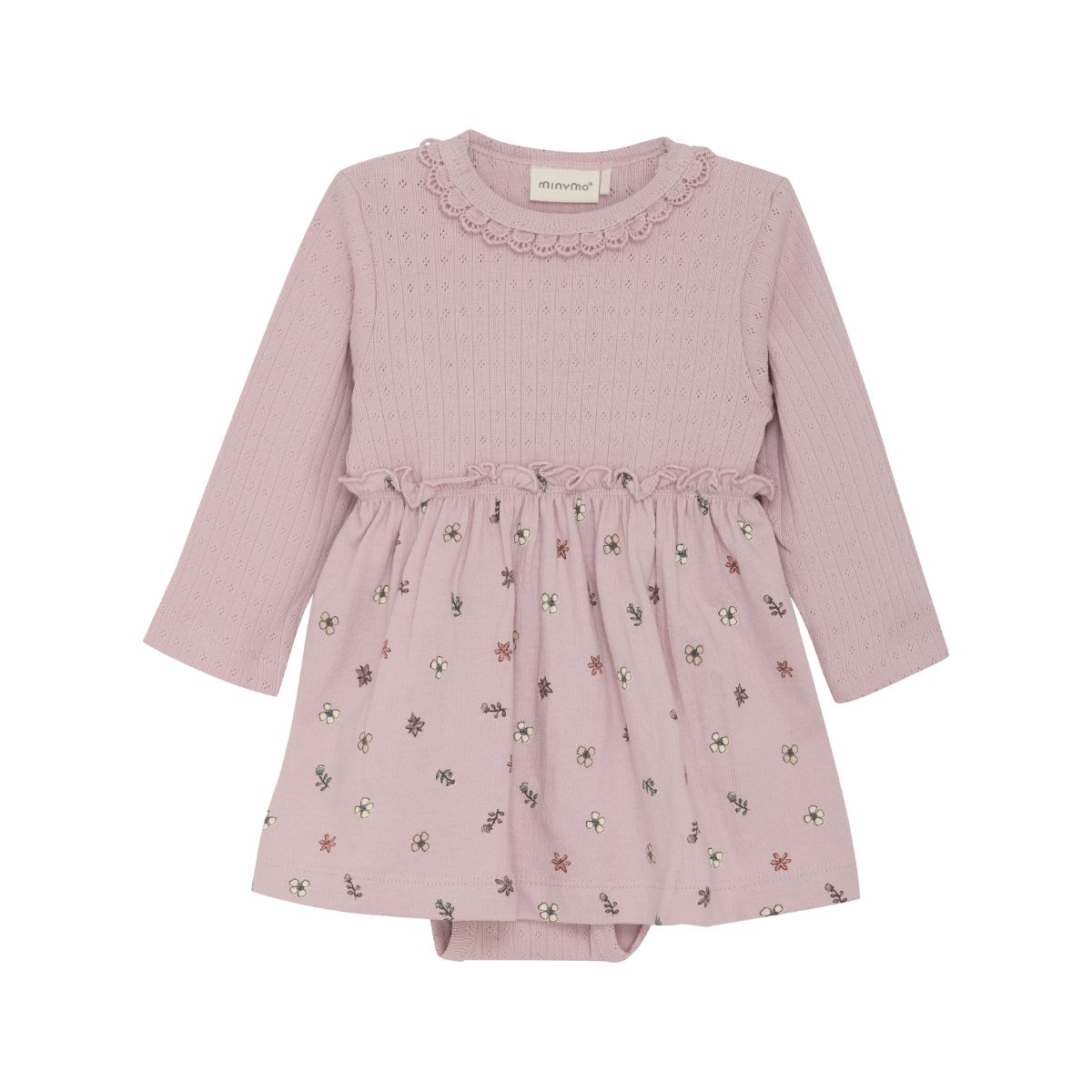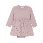 Nice long-sleeved bodysuit with allover print from Minymo. The body dress is made of a soft cotton blend and has a nice flower/dot print and a nice detail at the neck. Fabric gatherings at the waist give a nice look. The body dress closes with hidden snaps on the shoulder and snaps between the legs.