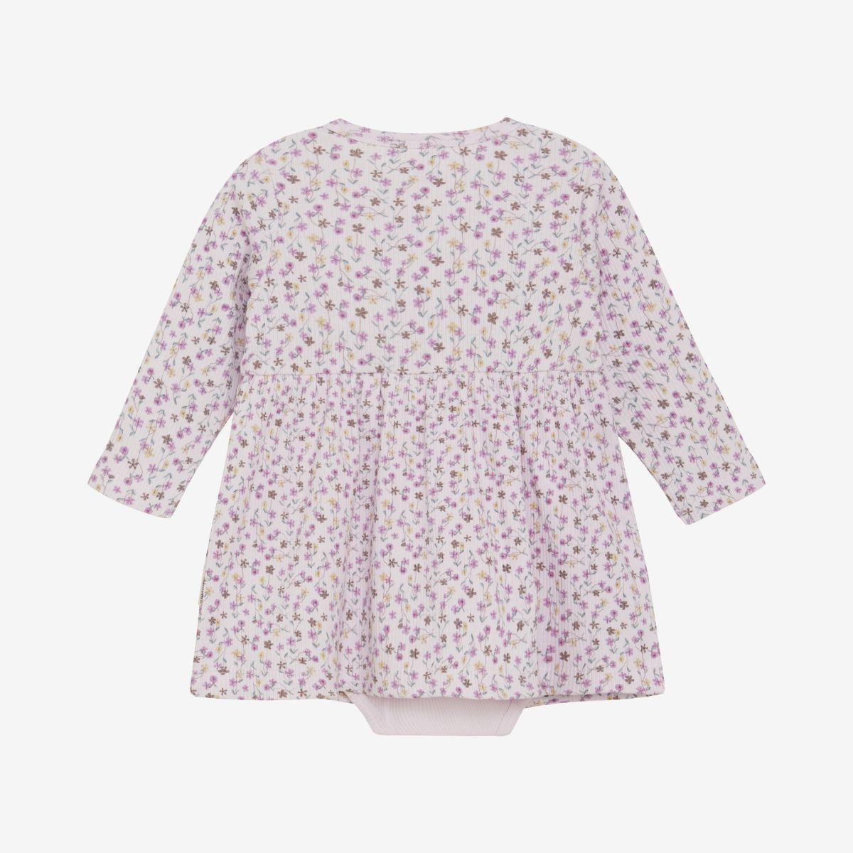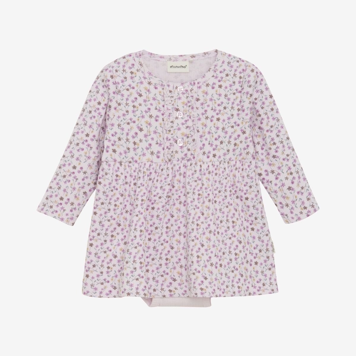 Nice floral body dress from Minymo. The dress has long sleeves and is made in a soft cotton blend. The dress has frill details and fabric gatherings, which give a nice girly look. Closes with press studs between the legs.