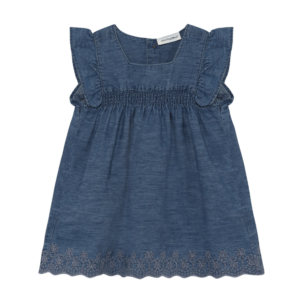 Sleeveless dress from Minymo. The dress has a denim look. It features ruffles on the shoulders, and the hem is wavy with patterns. Additionally, the dress has an elastic band above the chest and a square neckline. It closes at the back. The dress is made of 100% cotton.
