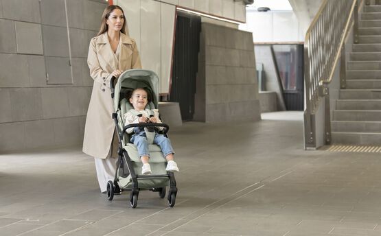 Wherever your journey takes you, the FLYLITE makes sure comfort is always on board. The extra-large extendable canopy with ventilation window protects your little one from sun and light rain while keeping the air fresh inside. Backrest ventilation adds breezy comfort on warmer days, and the included comfort soft insert makes every ride cosy and snug. Thanks to smooth all-wheel suspension and swivel wheels, every stroll feels effortless – whether through the park, the city, or on your travels.