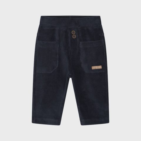 Jogging trousers in soft velvet with elastic at the waist. The model has pockets at the front and a fly with decorative buttons.