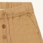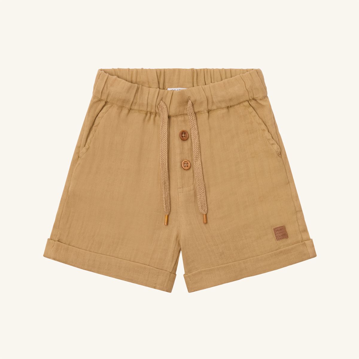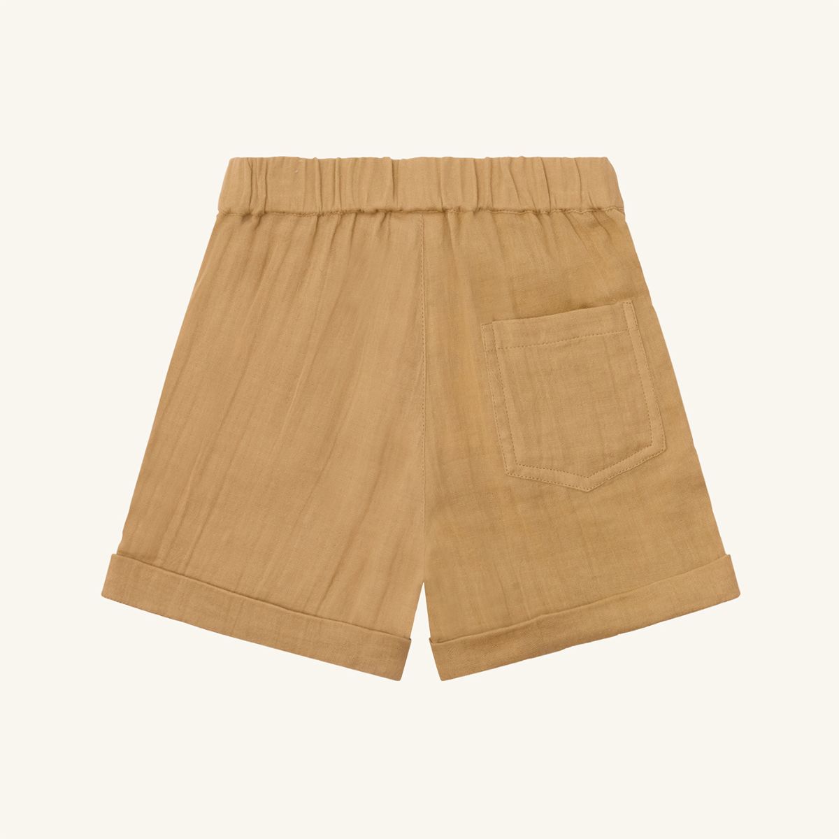 Shorts in woven cotton with an elasticated drawstring waist. The garment has front pockets and a single back pocket on the right, a fly with decorative faux wood buttons and a pleat pattern. – Adjustable waist. This product is made from 100% organic cotton.