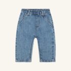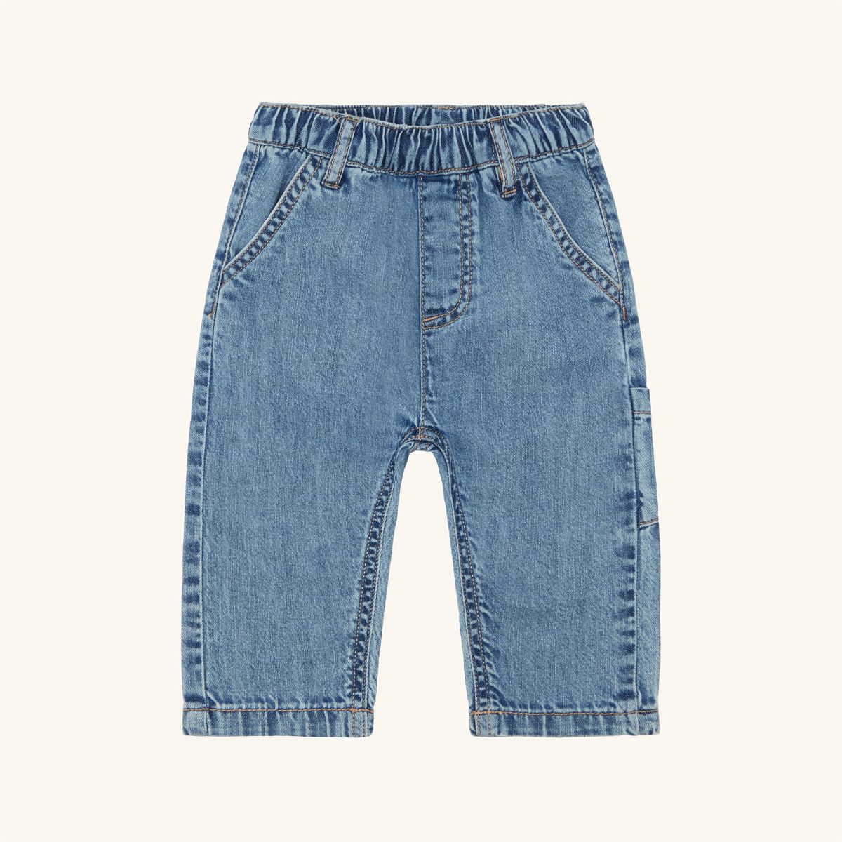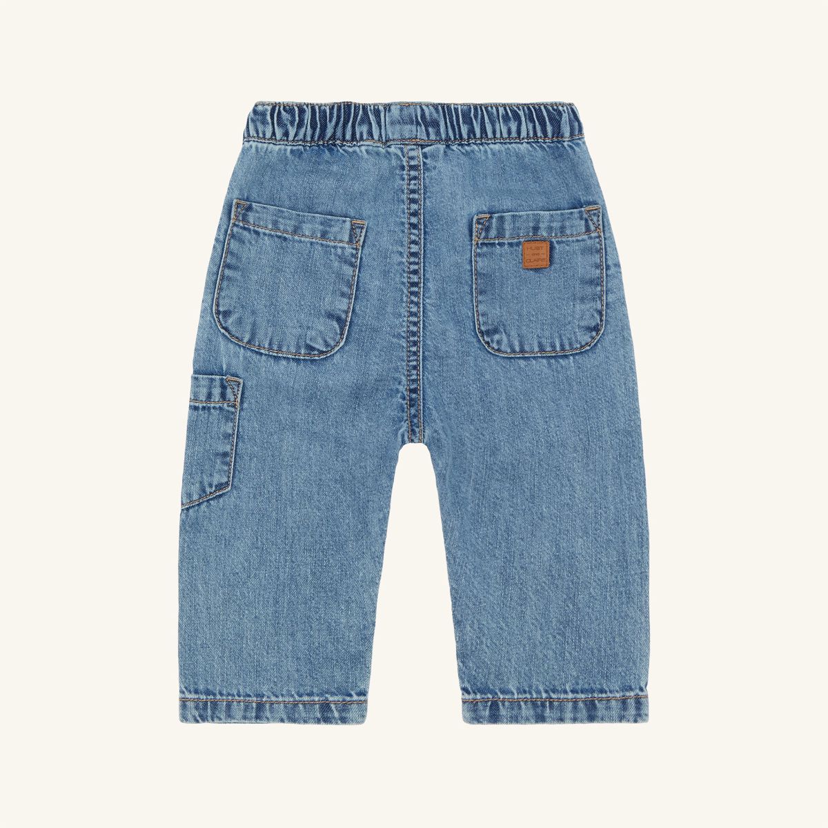 Jeans in soft denim with elastic at the waist. They have a loose fit for optimal comfort. The pants have practical front and back pockets and an extra pocket on the left leg. The model has an adjustable waist.