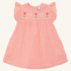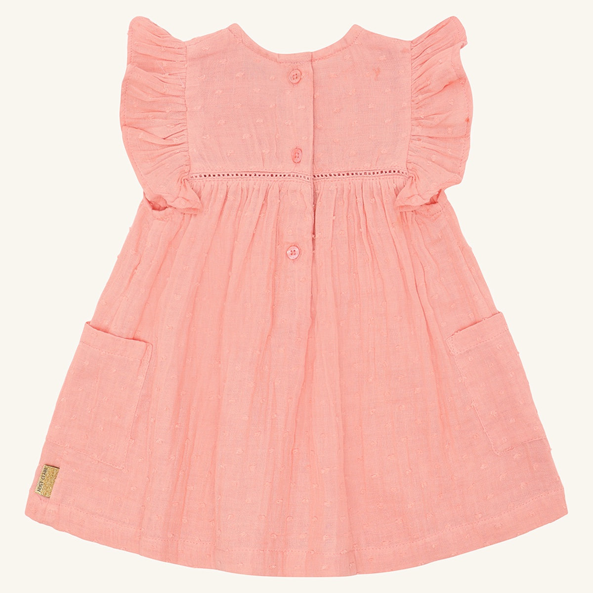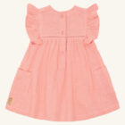 Lined twill dress with a heart print. The garment features ruffles across the shoulders and is cut at the waist with ruching for extra volume and movement. Button fastening on the back. This product is made from 100% organic cotton.