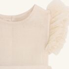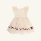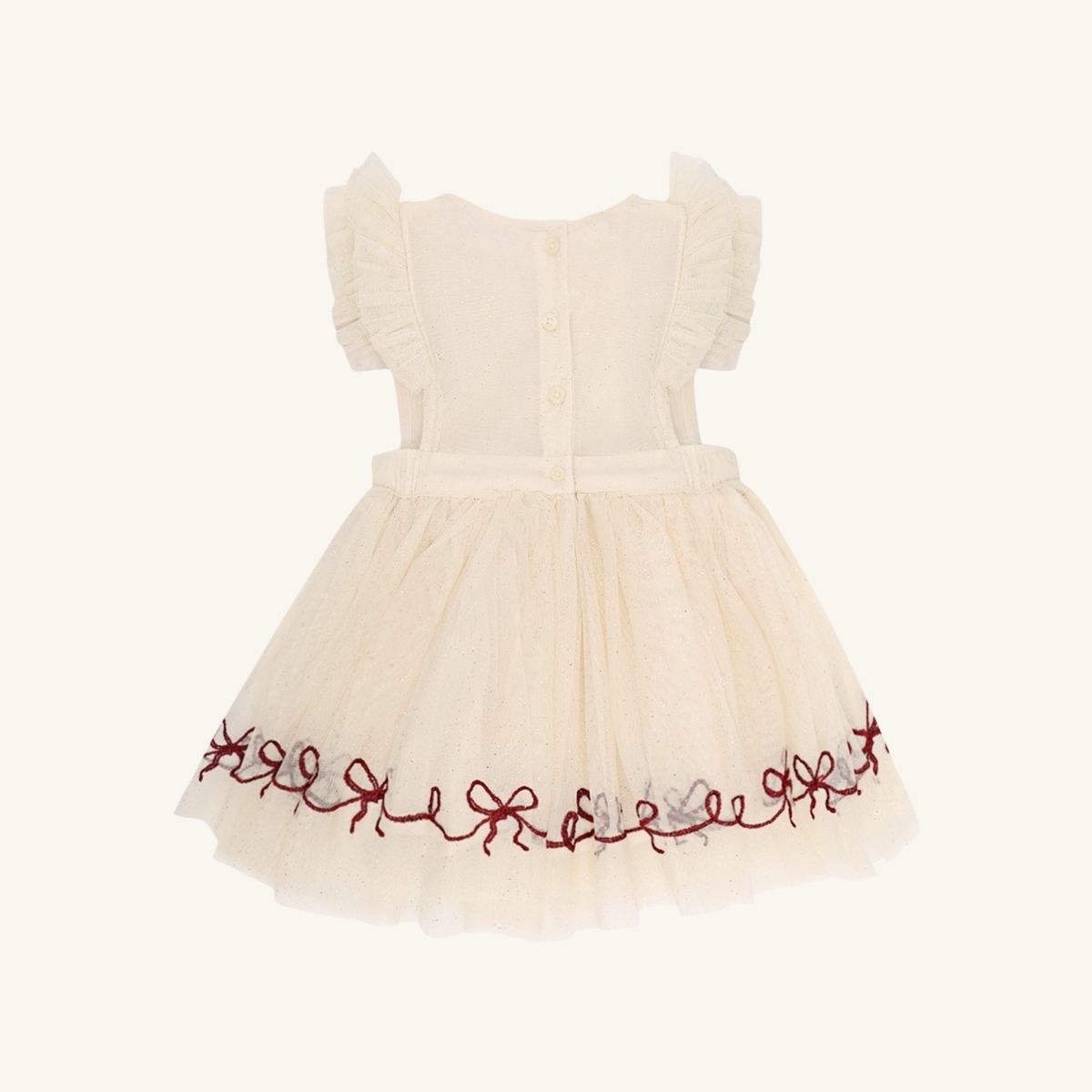 Beautiful festive dress crafted from shimmering tulle with sparkling details throughout. The Katinka Glitter dress features charming ruffle sleeves, a voluminous skirt, and delicate gold embroidery with bow motifs along the hem, perfect for creating magical holiday memories. Fully lined in soft cotton for comfort, this dress ensures your little one feels as good as she looks. The back closes with covered buttons for easy dressing. Ideal for Christmas parties, family gatherings, or any special occasion where a little extra sparkle is called for.