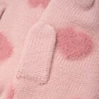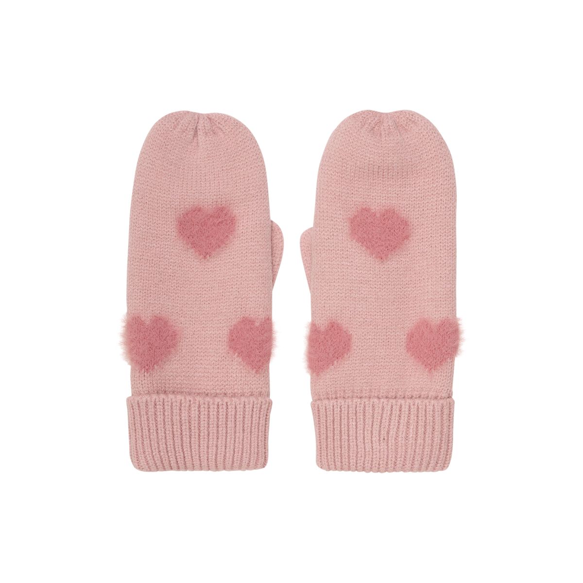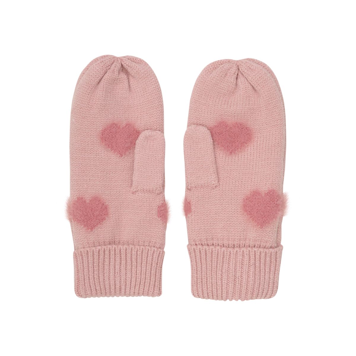 Lovely Minymo mittens in pink with plush hearts all over in a darker shade. The Minymo mittens are knitted and have wide, fold-over ribbed edges at the openings. The mittens have a plush lining on the inside.