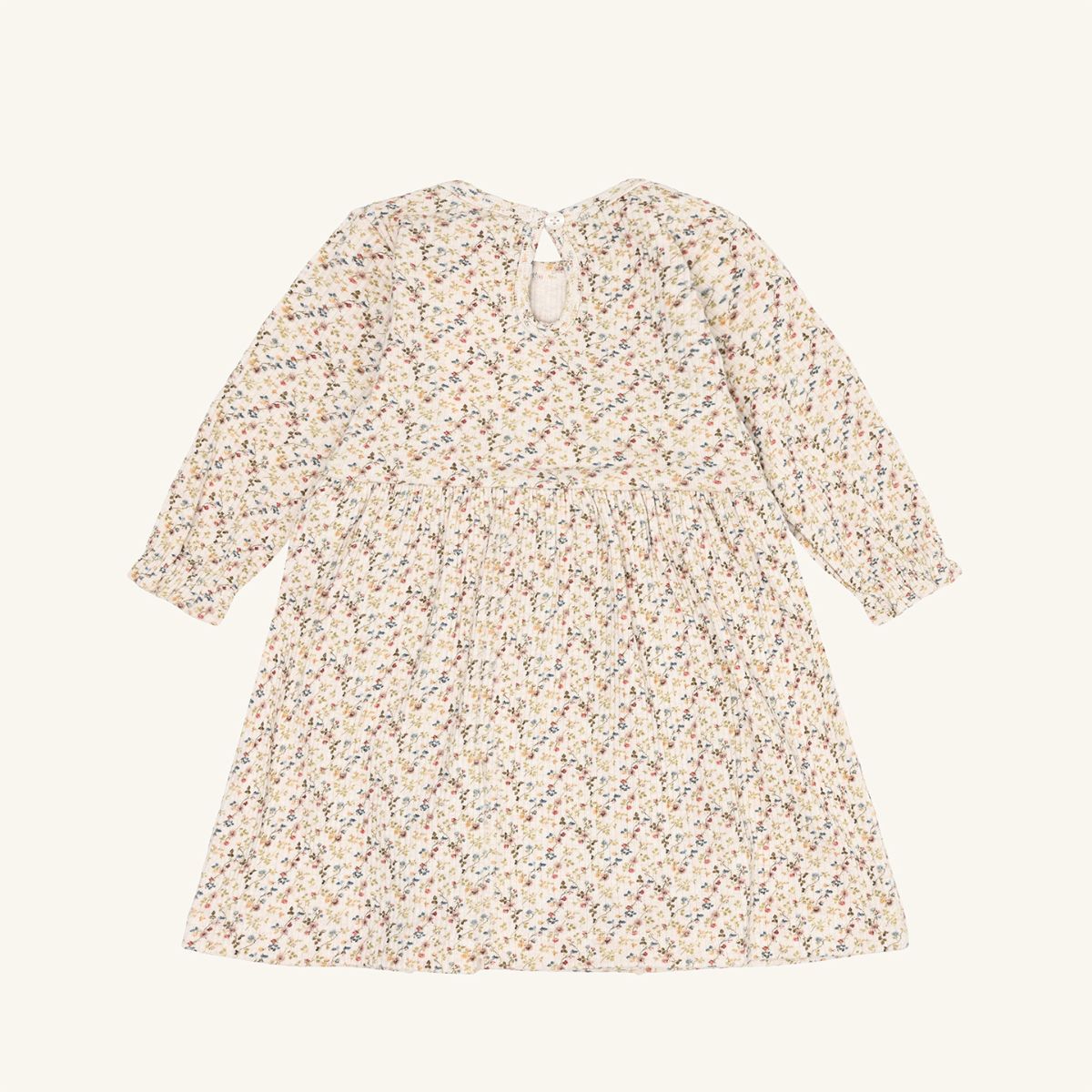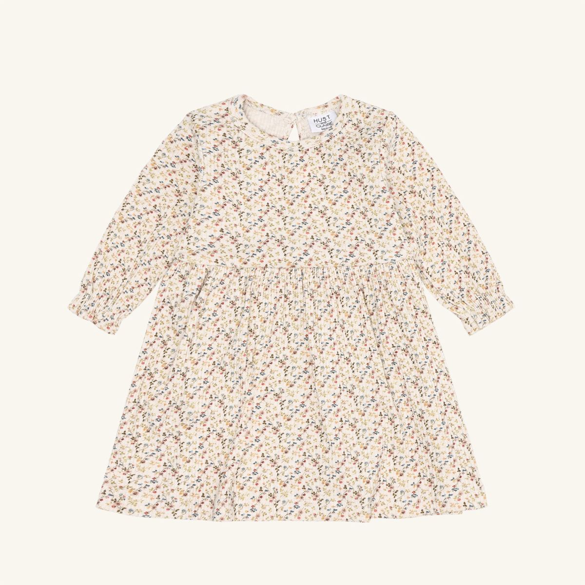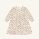 Cute Hust and Claire bodysuit w. skirt in beige with a floral print in fine colours. The dress body has a ribbed structure, a round neckline with a button at the neck and long sleeves with elastic at the wrists. It is cut at the waist, where there are gathers, which give the skirt good width. Inside there is a bodysuit, which closes between the legs with push buttons. The dress body is made of a soft blend of organic cotton and modal.