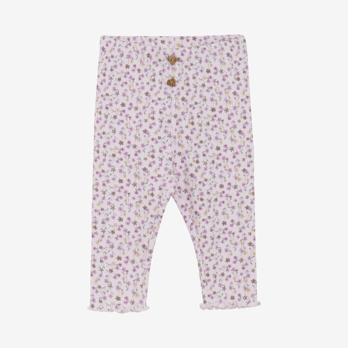 Cute leggings in a soft and comfortable cotton rib. The pants feature a lovely floral print and charming details such as frills at the ankles and beautiful heart-shaped wooden buttons.