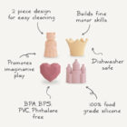 The princess bath play set features a crown, castle, heart gem and bear princess made from 100% food grade silicone, with pieces that open into two parts for easy cleaning and fast drying. The nature teething ring invites sensory exploration with its raised leaf texture and three earthy silicone charms shaped like a sun, rainbow and daisy to soothe and engage teething littles. Completing the set, the flower press toy encourages fine motor development with its soft colors, simple design and satisfying pop.