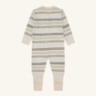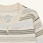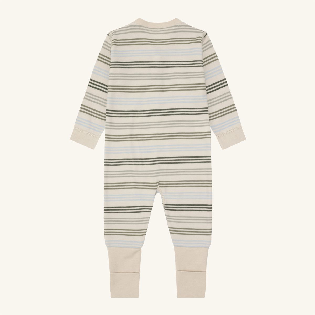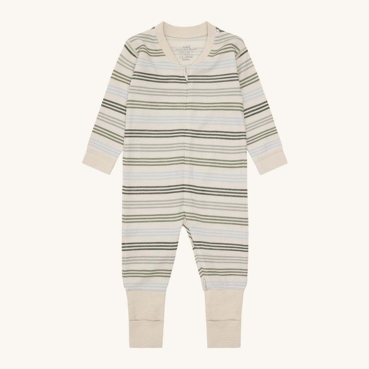 Long-sleeved jumpsuit in soft, stretchable wool and bamboo viscose blend with stripes. Designed with a practical two-way zip that opens both from the top and from the left foot, making dressing and nappy changes easy. The suit features foldable cuffs at the feet that can be worn as socks or turned up as needed. Bamboo viscose on the inside ensures a smooth feel against the skin, while wool on the outside provides natural warmth and comfort.
