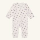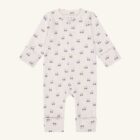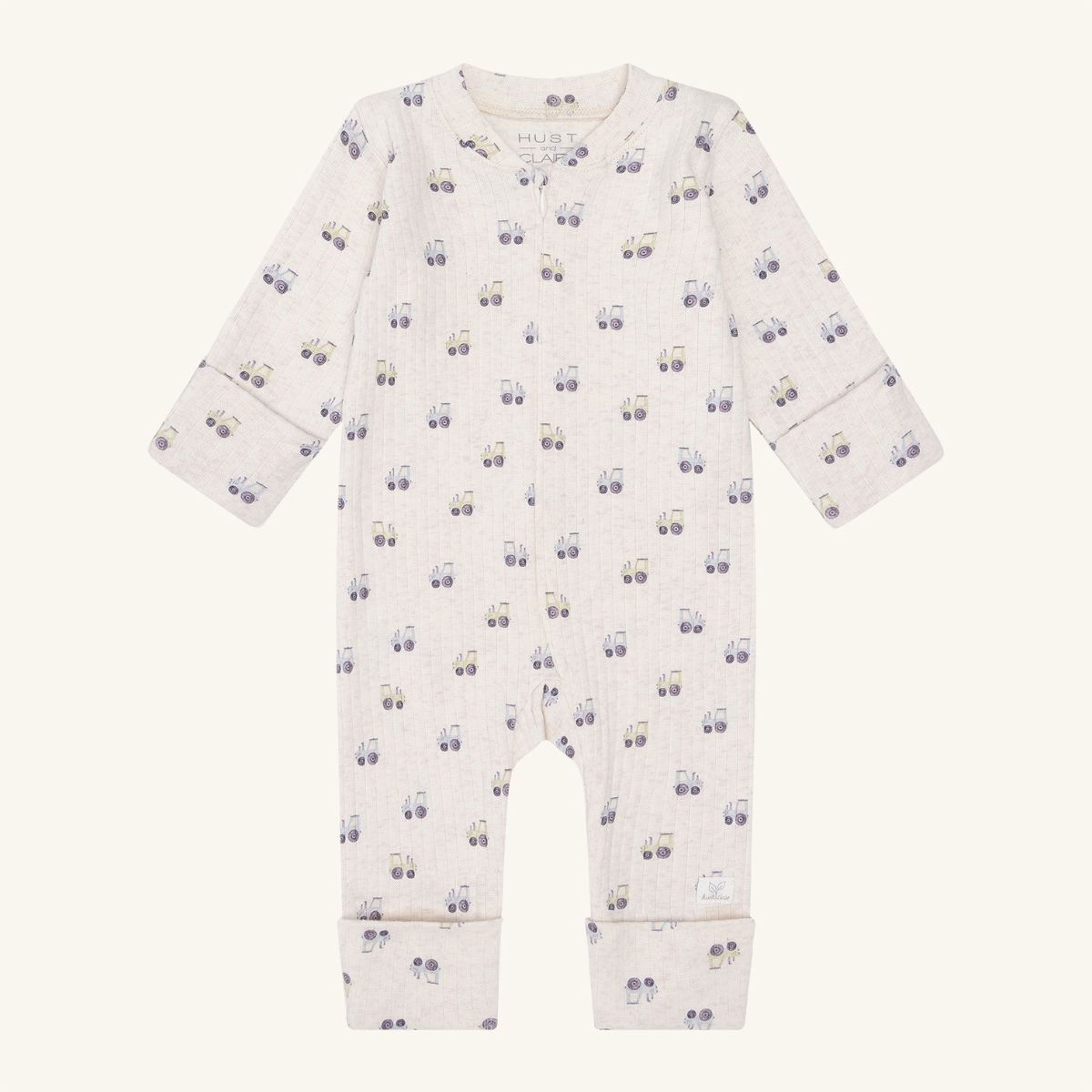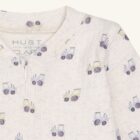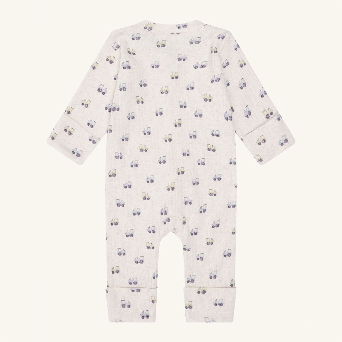 Long-sleeved protective jumpsuit in wide rib quality, with a tractor print. Designs close with a zipper in the front down over the stomach and to the left foot. The sleeves and legs of the jumpsuit are hemmed.