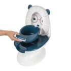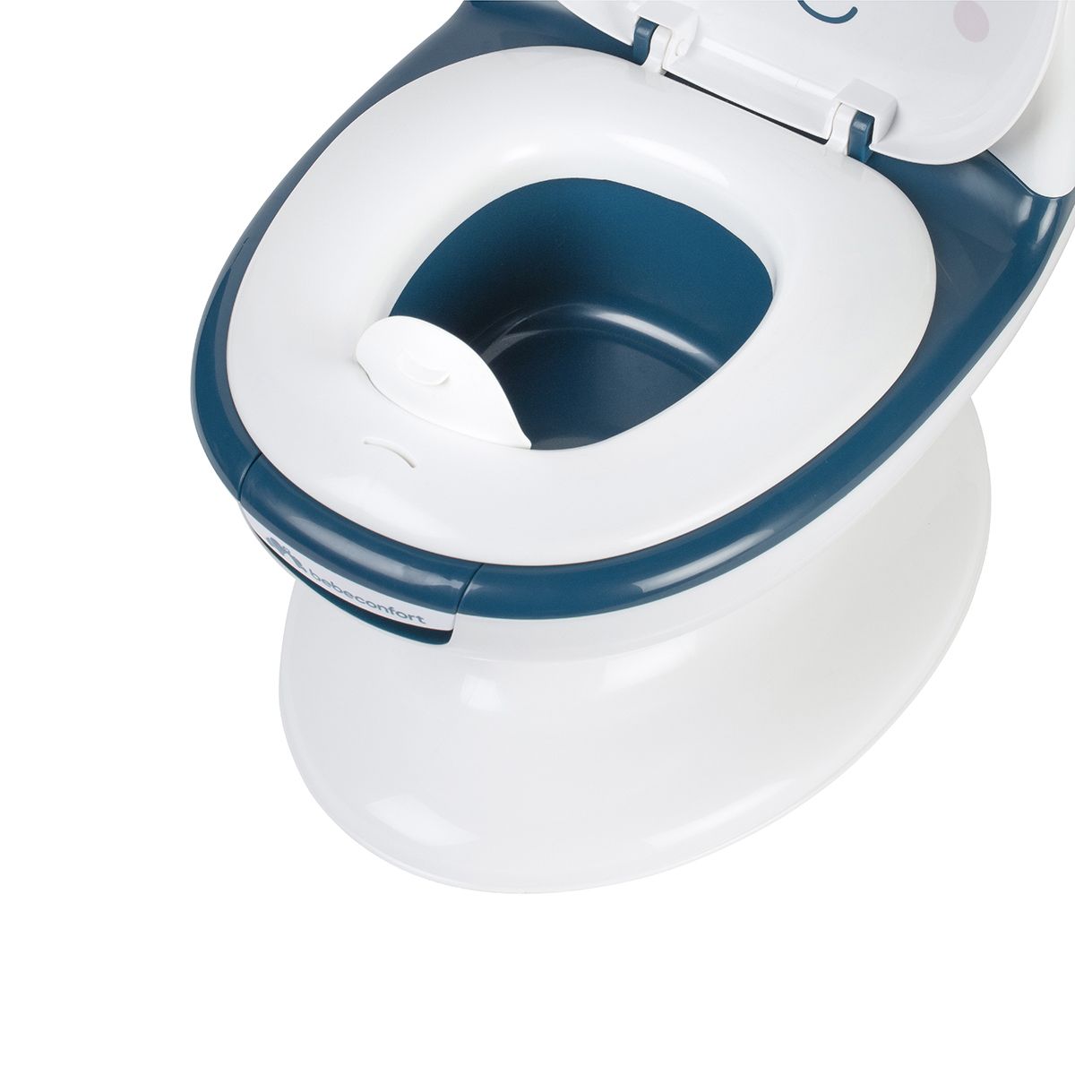 Smart Bebeconfort toilet in white plastic and bear print. The Bebeconfort toilet is a little model which is suitable for the smallest kids who are learning to use a real toilet. The Kid can sit on the toilet seat, and there is a bowl at the bottom of the basin, which is easy to clean. Finally, you can press a button on the side of the toilets so that it sounds like the toilet is flushing. At the top of the toilet there is space for storage cleansing wipes.