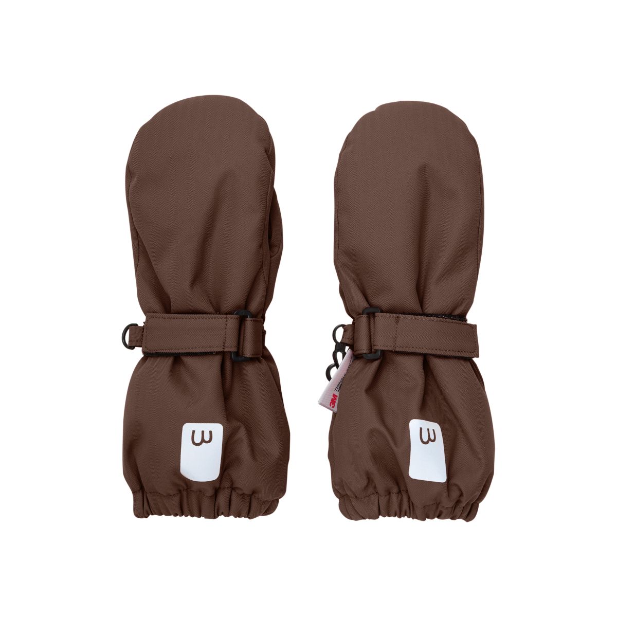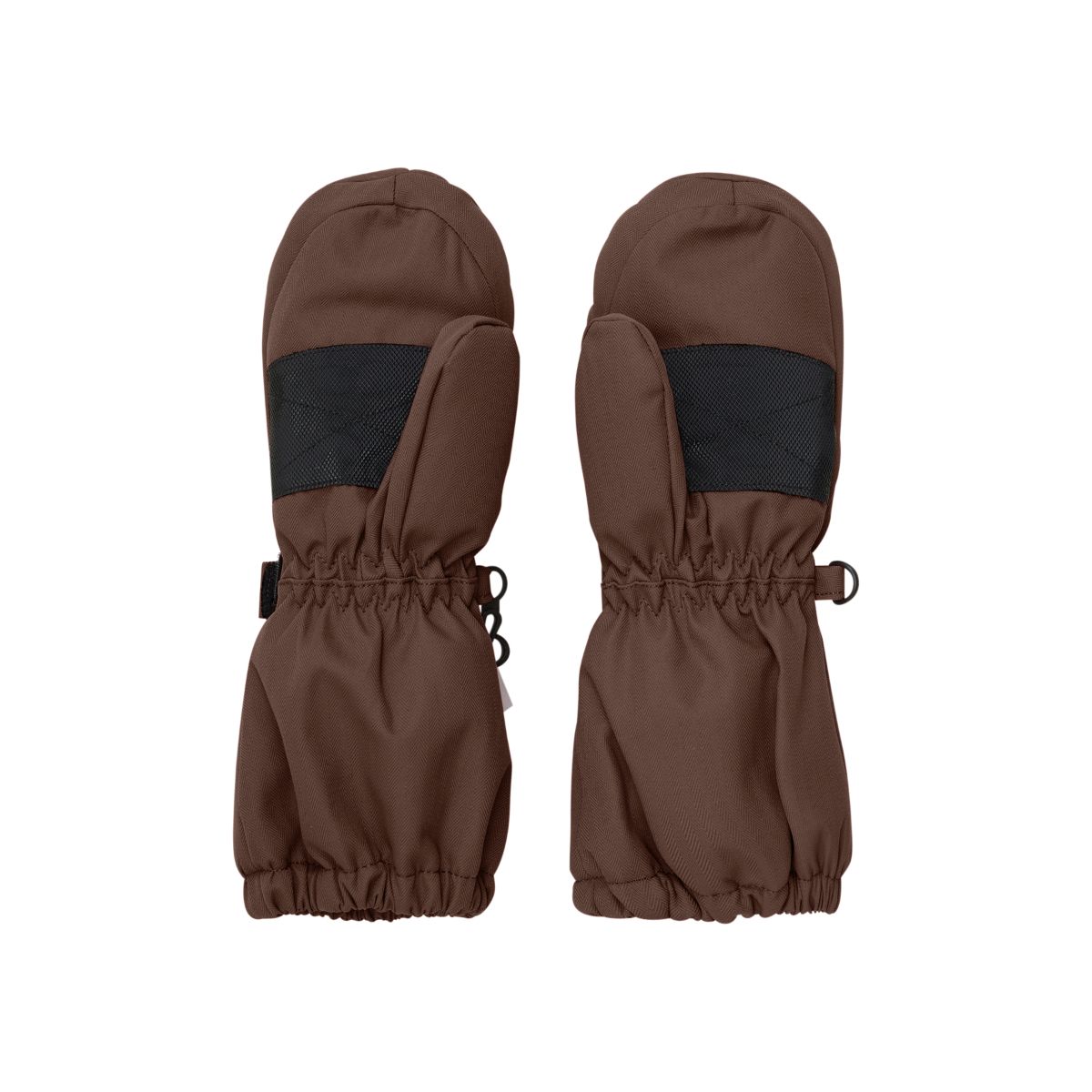 Nice Minymo mittens in dark brown with a little reflective logo at the top. The Minymo mittens have elastic in the opening, and can be tightened with a Velcro strap around the wrist. The Mittens have a soft fleece lining inside.