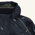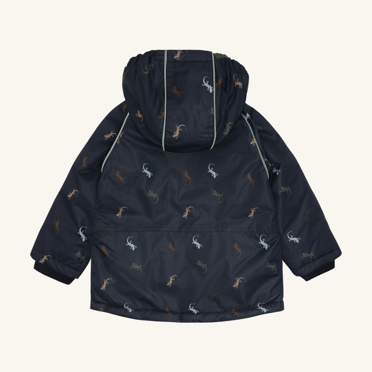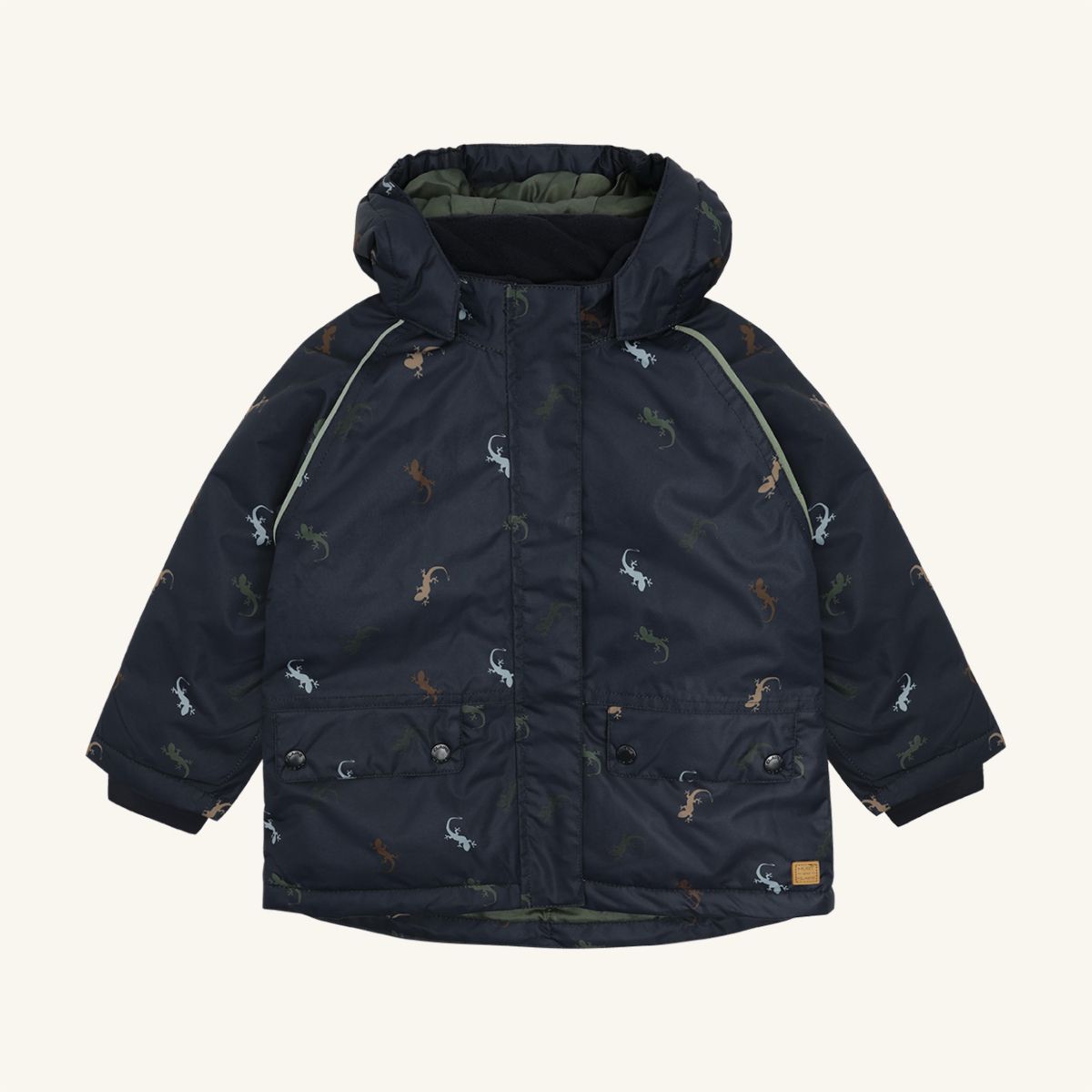 Nice Hust and Claire winter coat in navy with an allover print of lizards in various subdued colours. The Winter coat has practical reflective piping and details in well-placed places. The Hust and Claire winter coat has a removable hood that fastens along the mid-high collar with push buttons. The hood has elastic inserts in the face opening. The arm openings have practical wind flaps and wide stretch edges with thumb holes. There are ventilation holes under the arms. The Winter coat opens at the front with a zipper with chin guard and internal wind pole. On the front, the winter coat has two distinctive flap pockets with Velcro closures. The waist opening has an internal adjustable elastic edge and has a high/low effect. The Winter coat is quilted, and on the inside it has both a fleece lining and a smooth woven.