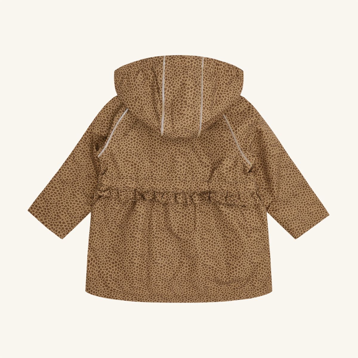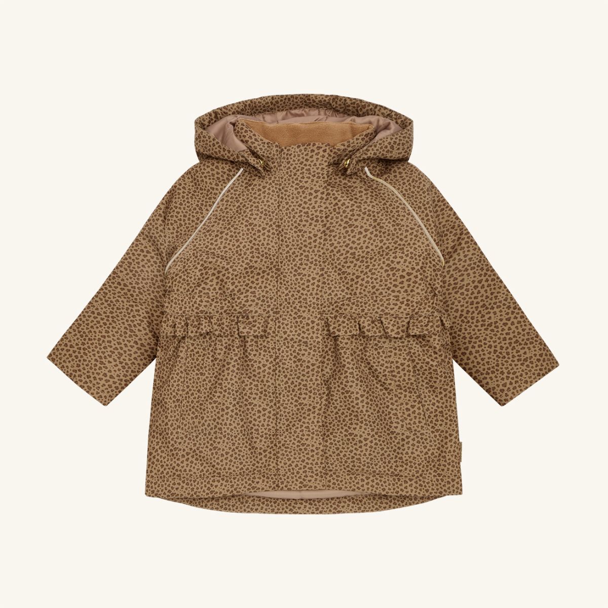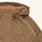 Nice Hust and Claire winter coat with leopard print in brown shades. The Winter coat has practical reflective piping and details in well-placed places. The Hust and Claire winter coat has a removable hood that fastens along the mid-high collar with push buttons. The hood has elastic inserts in the face opening. The arm openings have practical wind flaps and wide stretch edges with thumb holes. There are ventilation holes under the arms. The Winter coat opens at the front with a zipper with chin guard and internal wind pole. On the front, the winter coat has two open side pockets. At the waist has an adjustable elastic edge inside, which is marked on the outside by a ruffle edge. The waist opening has a high/low effect. The Winter coat is quilted, and on the inside it has both a fleece lining and a smooth woven.