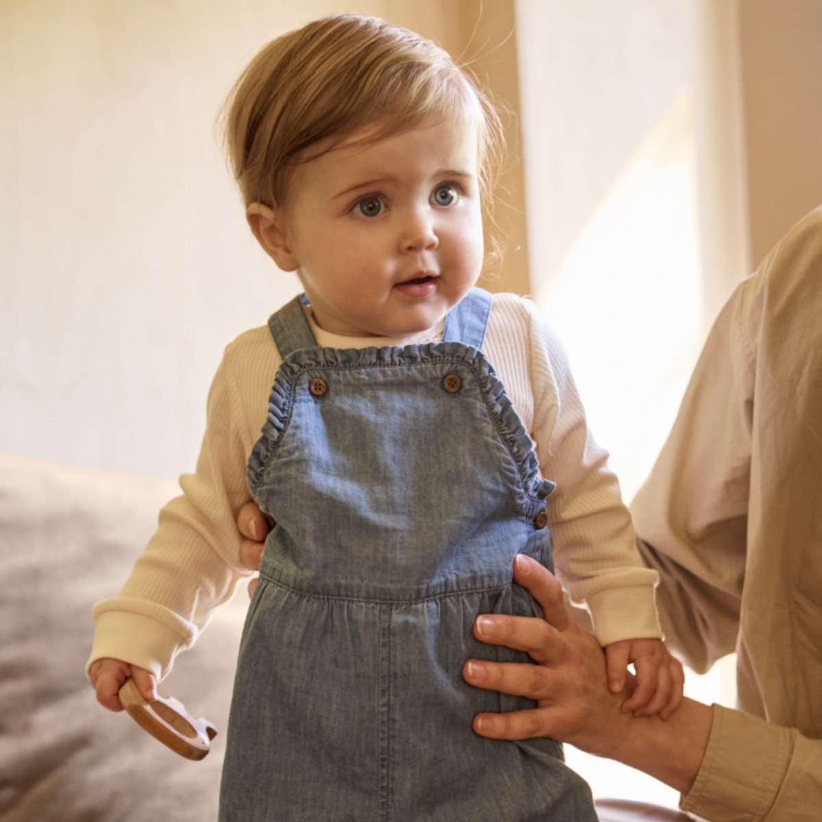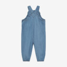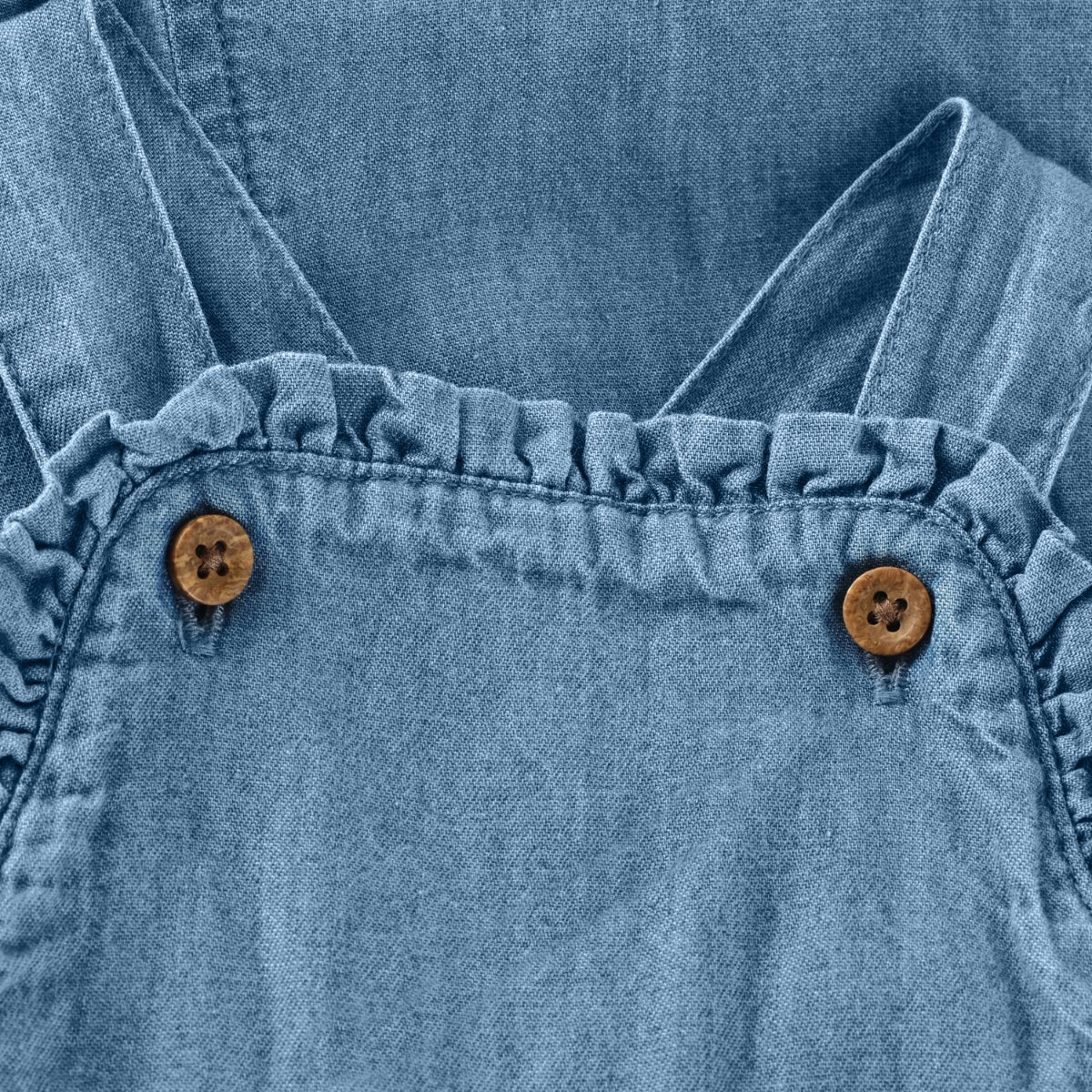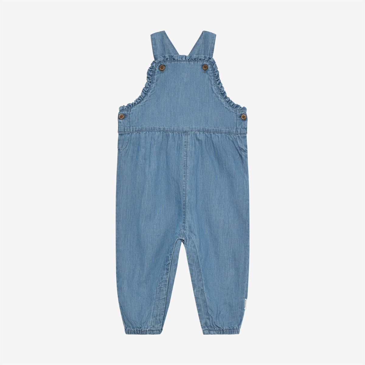 Overall from Minymo. The overall features a frill on the upper part. Additionally, it has buttons that make it adjustable in size. The overall is elastic at the waist and ankles. It is made of 100% cotton, which gives a denim look.