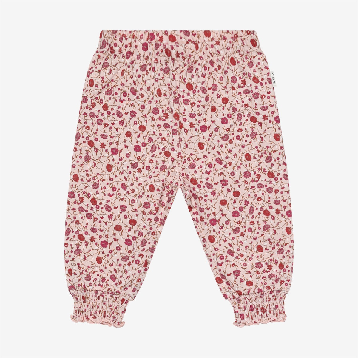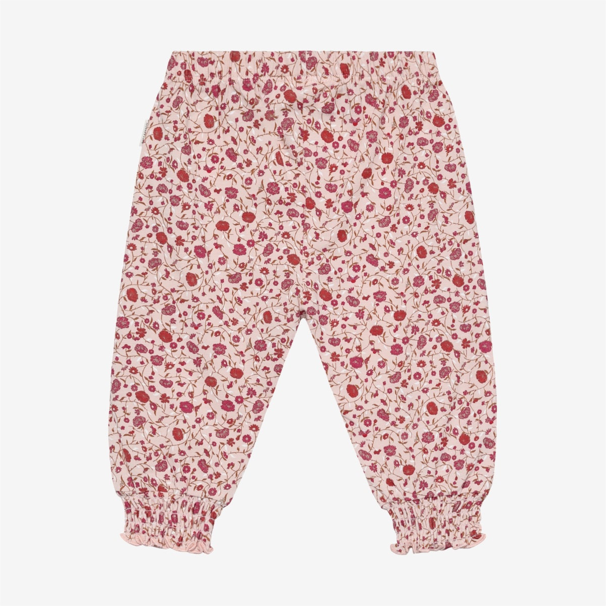 Pants from Minymo. The pants feature an all-over print. They are elastic and have an elastic waistband. At the ankles, small pleats are formed by an extra elastic band. They are made of a cotton blend. Certified acc. to GOTS – organic CERES-0366