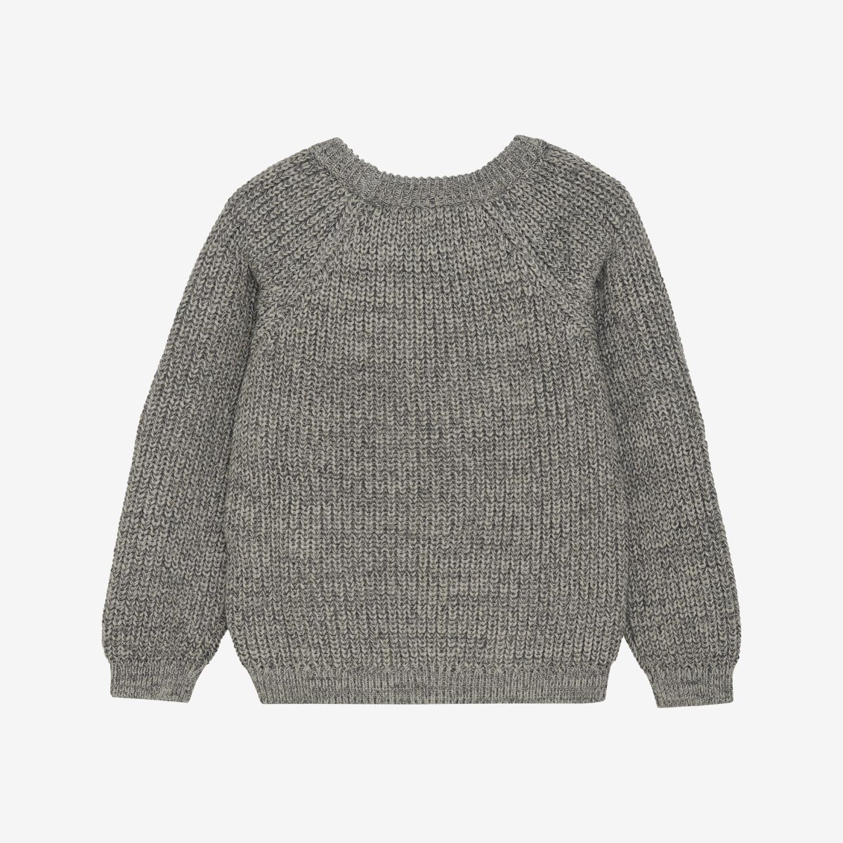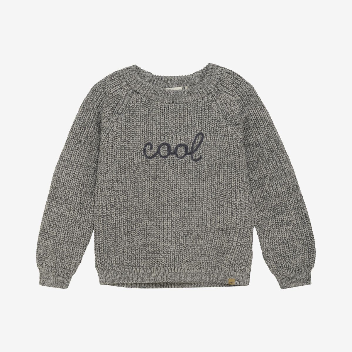 Knitted sweater with text on the chest and ribbed edges at the neckline, cuffs, and hem, ensuring a classic and comfortable fit.