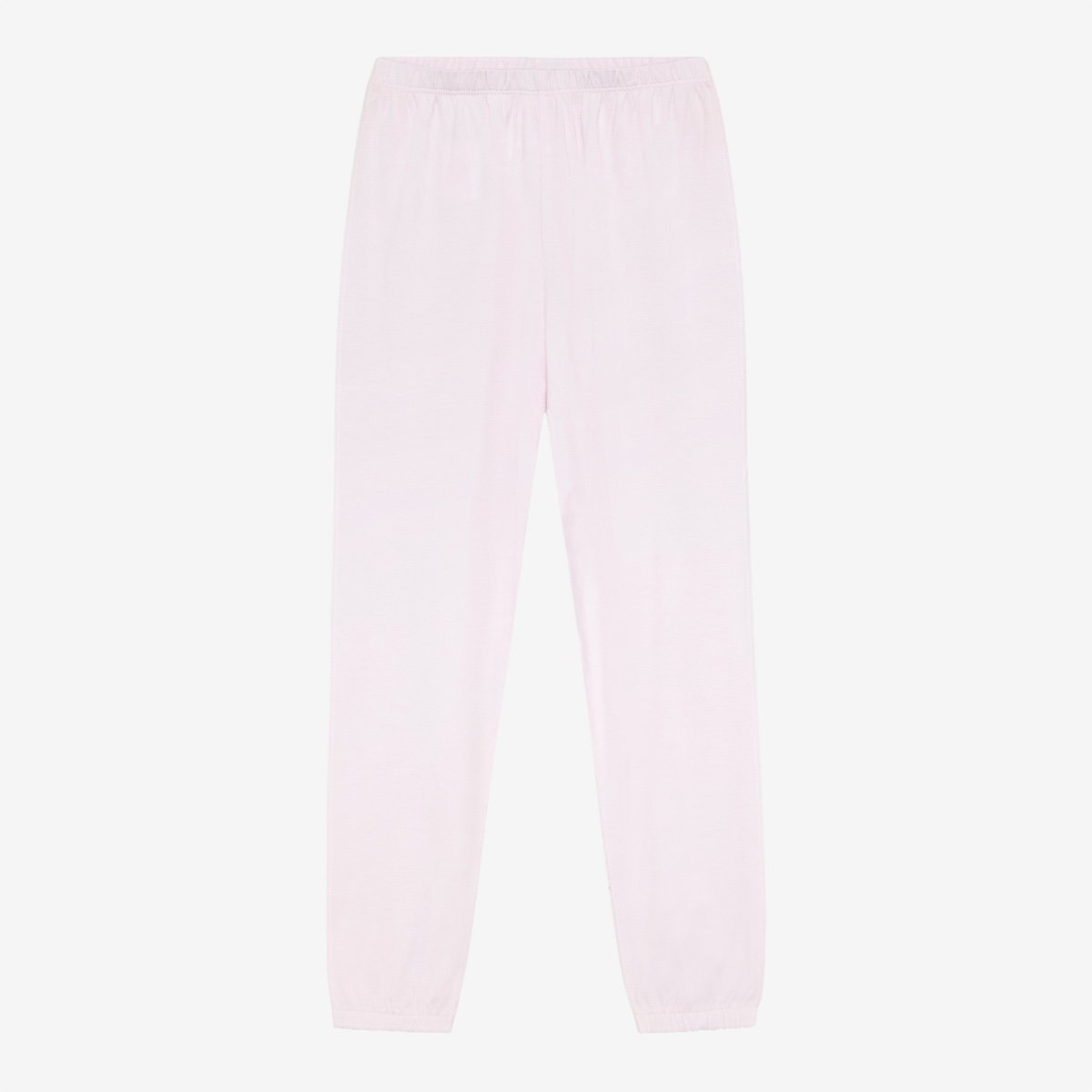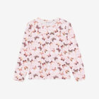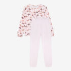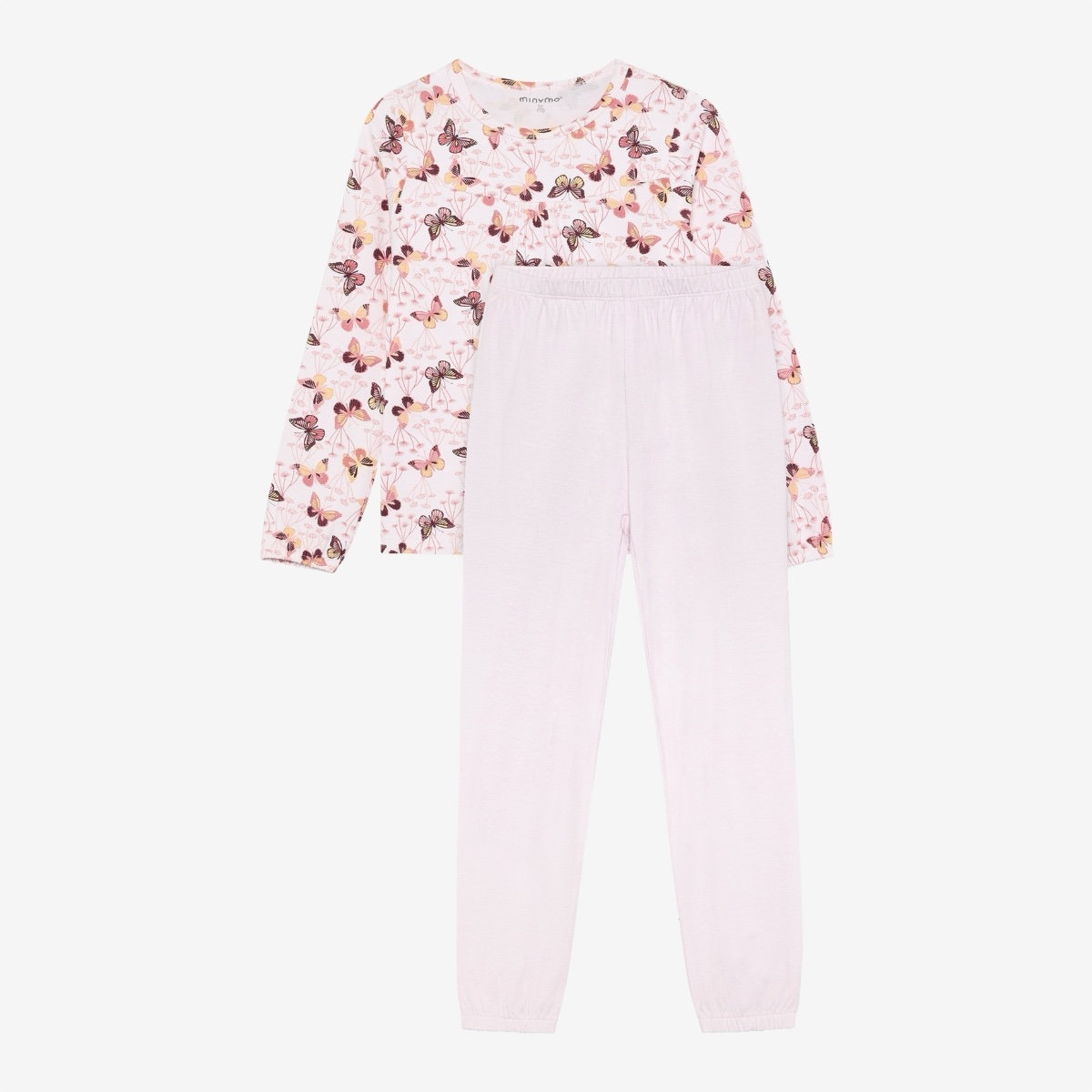 Sleepwear set from Minymo. The set includes a long-sleeved top and a pair of pants. The top features a round neckline, a gathered effect at the chest, and a delicate all-over print. The pants have an elastic waistband and elastic cuffs at the ankles. The set has a loose fit.