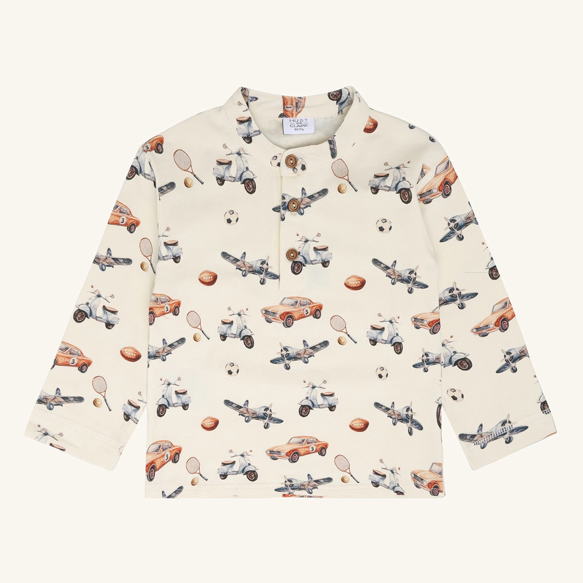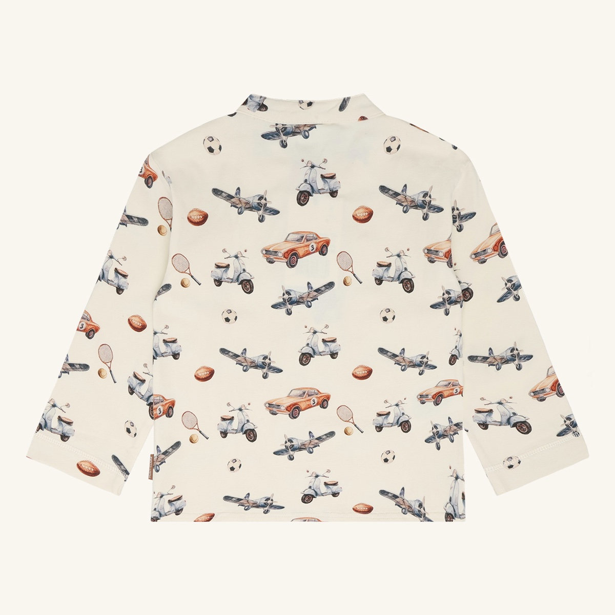 Crafted for comfort, this long-sleeved T-shirt is ideal for everyday adventures. The soft material ensures breathability, while the playful pattern featuring cars, planes, and sports equipment adds a touch of fun to any outfit. Perfect for layering or wearing on its own during warmer days.