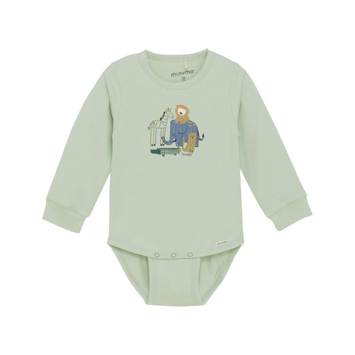 Beautiful long-sleeved body with print from Minymo. The body is made of a soft cotton blend and has a nice print on the front. The body closes with hidden snaps on the shoulder and snaps between the legs.