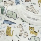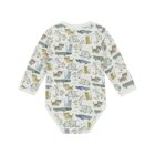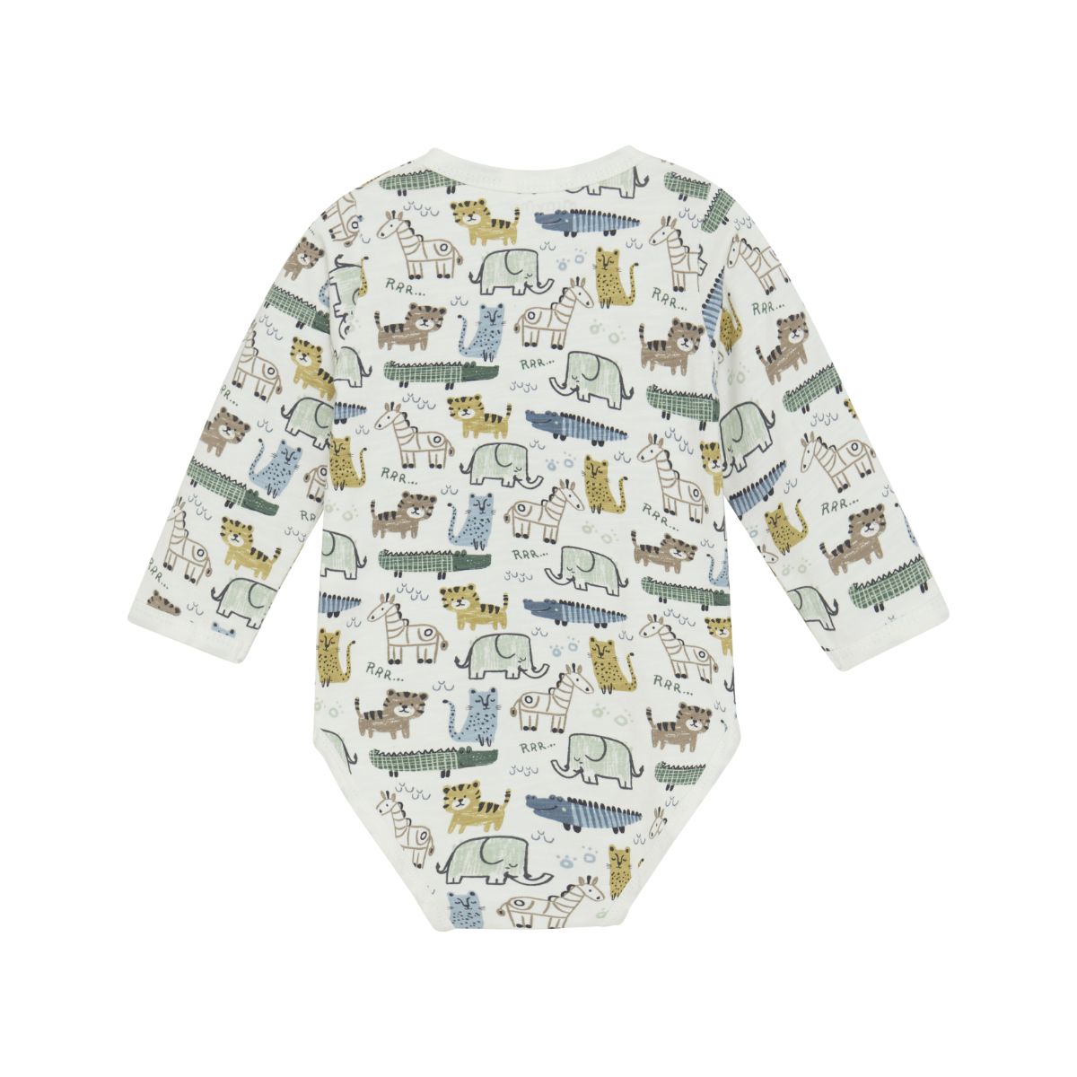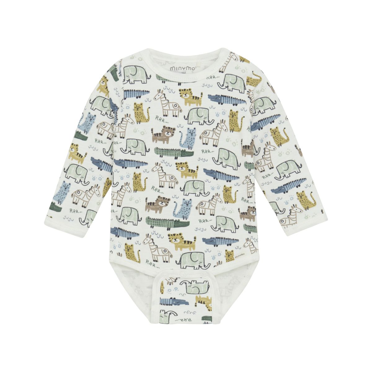 Beautiful long-sleeved body with allover print from Minymo. The body is made of a soft cotton blend and has a nice allover animal print. The body closes with hidden snaps on the shoulder and snaps between the legs.