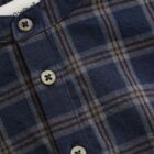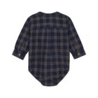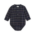 Elegant Minymo shirt bodysuit in dark blue with a check print in shades of brown. The shirt body has a classic round neckline with a mandarin collar and buttons at the front. It has long sleeves with cuffs at the wrists. The Minymo bodysuit has a comfortable fit with elastic edges at the leg openings. It closes between the legs with push buttons.