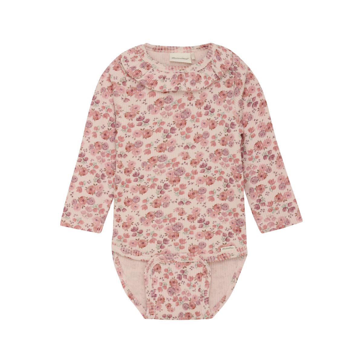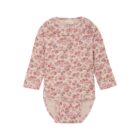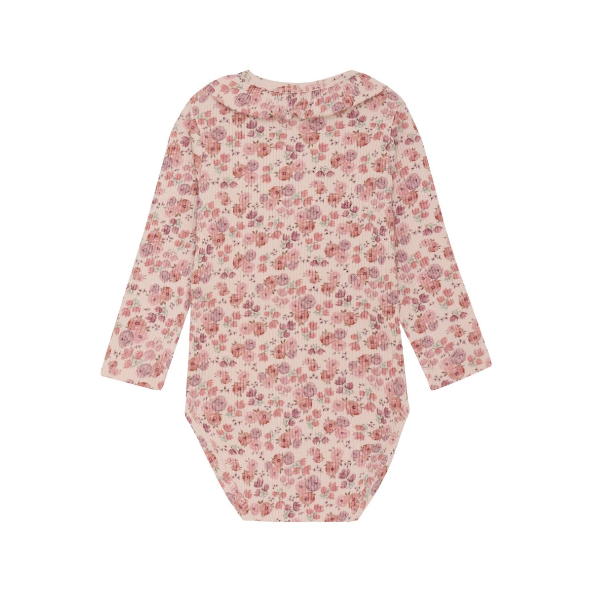 Beautiful long-sleeved body with allover print from Minymo. The body is made of a soft cotton blend and has a nice allover floral print. Fine frill details at the neck give a nice look. The body closes with hidden snaps on the shoulder and snaps between the legs.