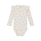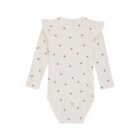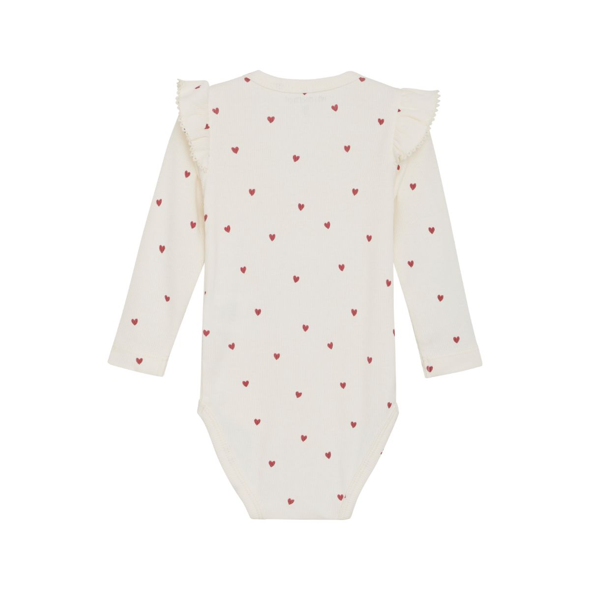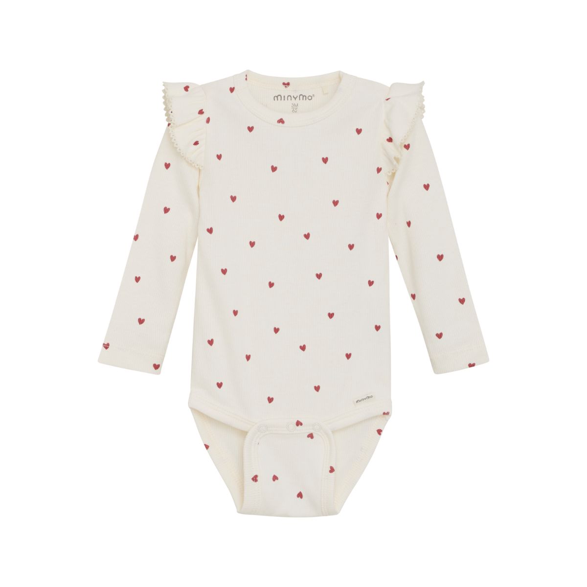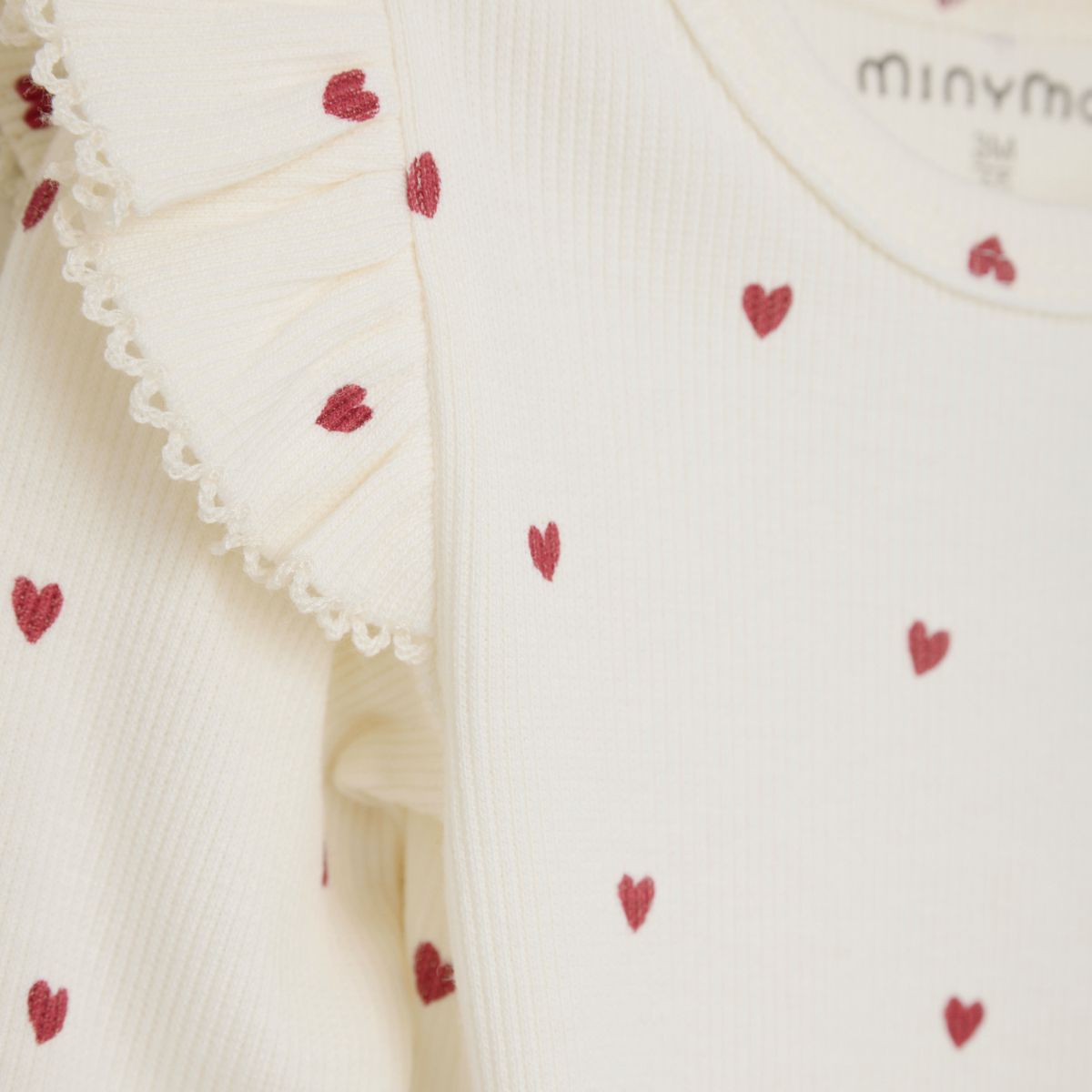 Charming Minymo bodysuit with long sleeves in white with small red hearts all over and with a nice ribbed structure. The bodysuit has cute ruffles on the shoulders, which adds a nice aspect. Minymo has designed the bodysuit with snaps between the legs, and it can be opened with hidden snaps at both shoulders.