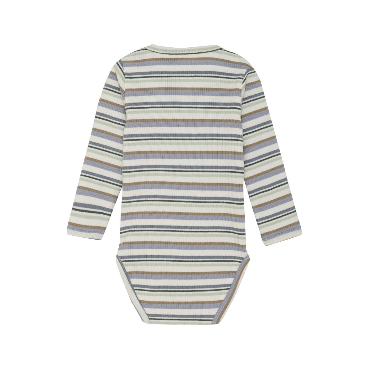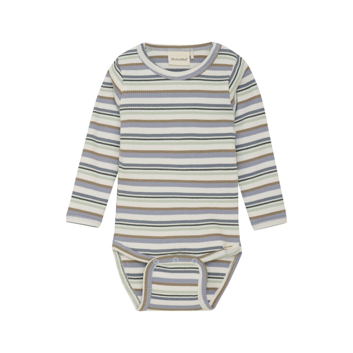 Beautiful striped long-sleeved bodysuit from Minymo. The body is made of a soft cotton blend that feels comfortable on the skin. The body closes with hidden snaps on the shoulder and snaps between the legs.