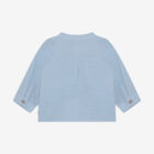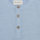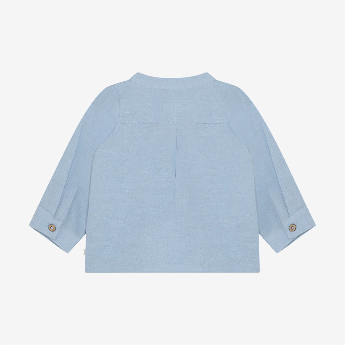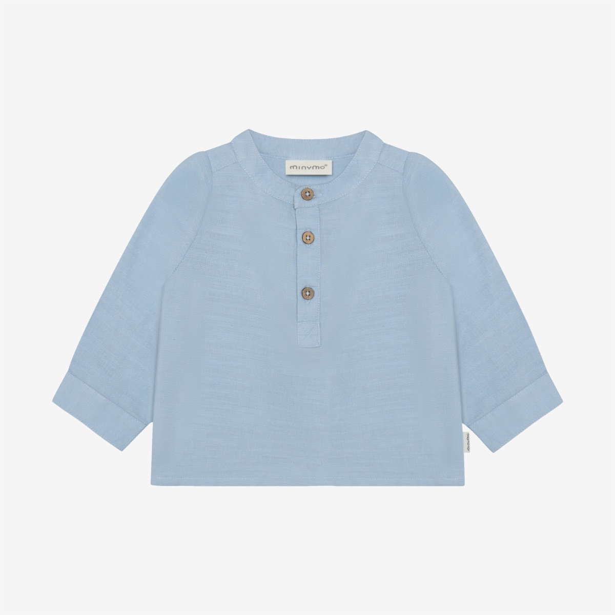 Shirt from Minymo. The shirt is solid-colored and has buttons halfway down the front. It is designed with a mandarin collar. The shirt is made of 100% cotton.